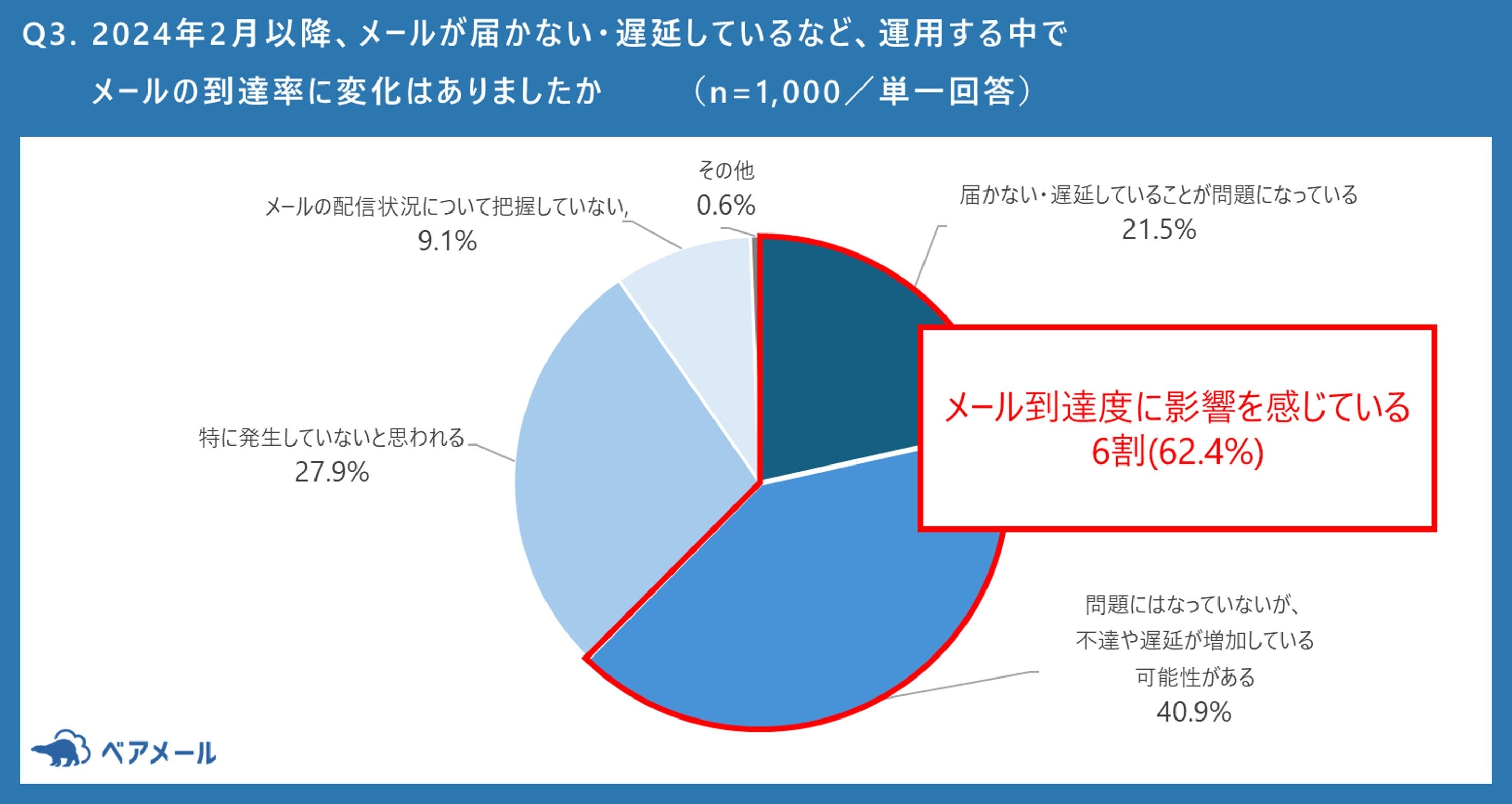 2024年2月以降、メールが届かない・遅延しているなど、メールの到達率に変化があったか聞いたところ、21.5%が「メールが届かない・遅延していることが問題になっている」、40.9%が「問題にはなっていないが、不達や遅延が増加している可能性がある」と回答し、Gmailガイドラインが適用された2月以降、少なからずメールの配信状況に変化が起こっていることが分かりました。