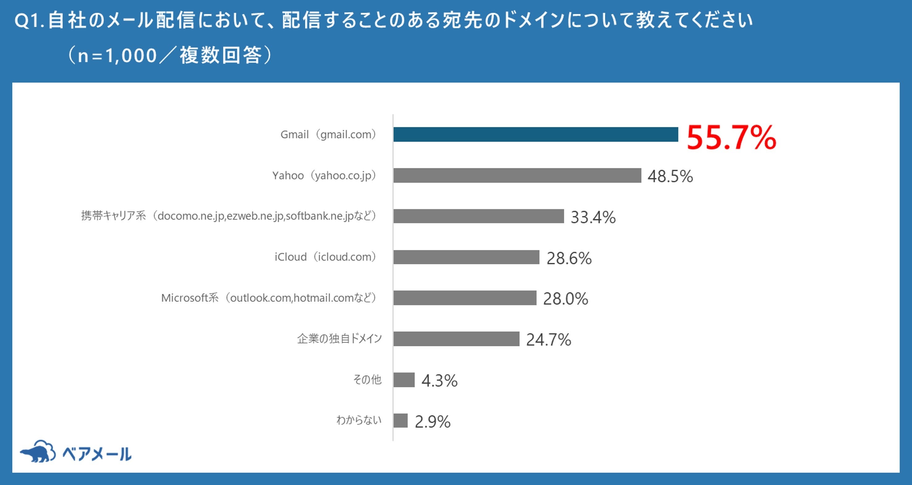 ・メール配信することのある宛先のドメイン1位は、Gmail(gmail.com)で55.7%。