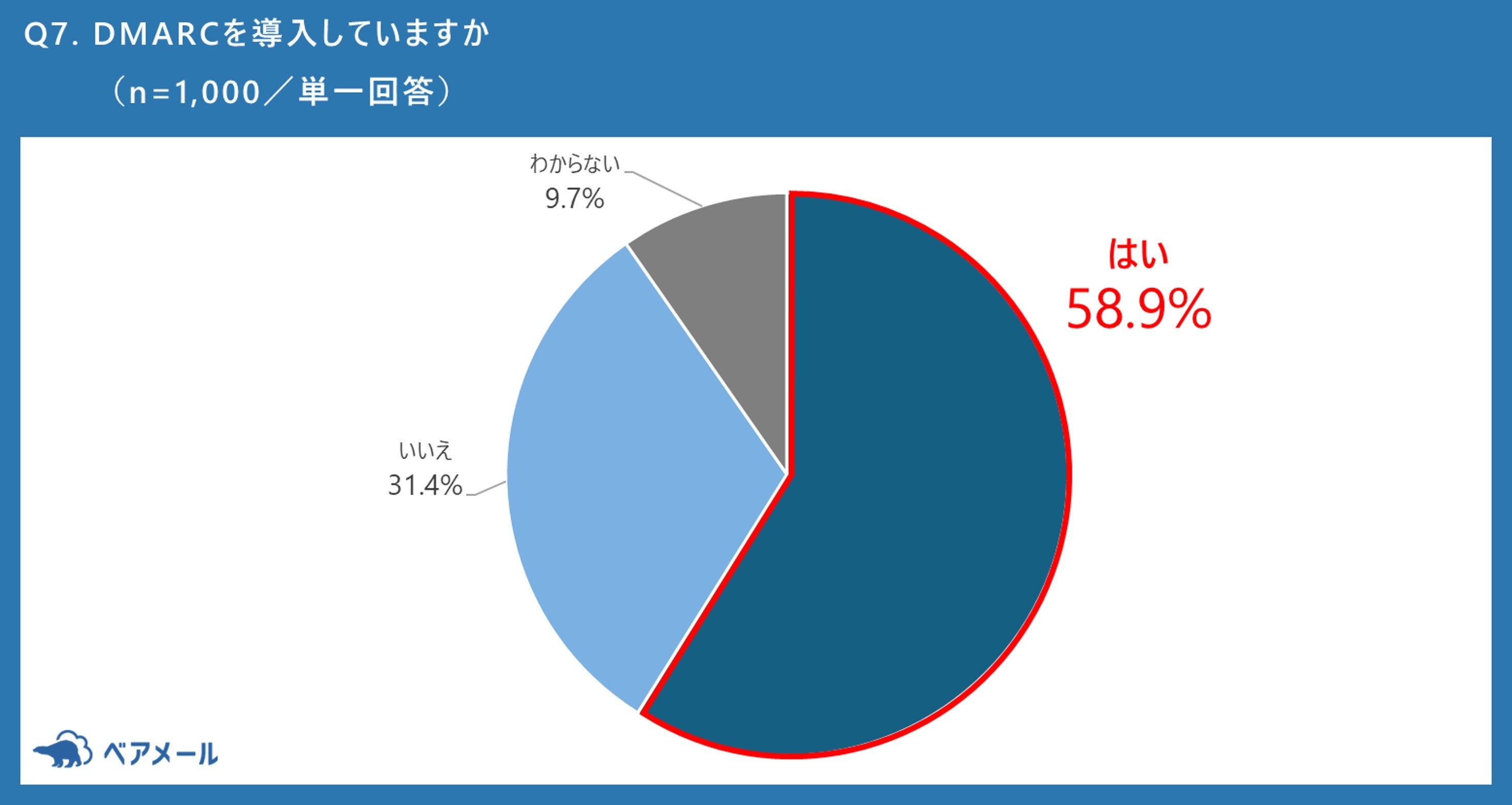 今回のGoogleの「メール送信者のガイドライン」において、1日5,000通以上Gmail宛に配信する送信者は対応が必須とされたことで注目度が急上昇したDMARC。調査対象者全員にDMARCの導入状況やレポートの活用状況について質問したところ、58.9%がDMARCを導入していると回答があった。