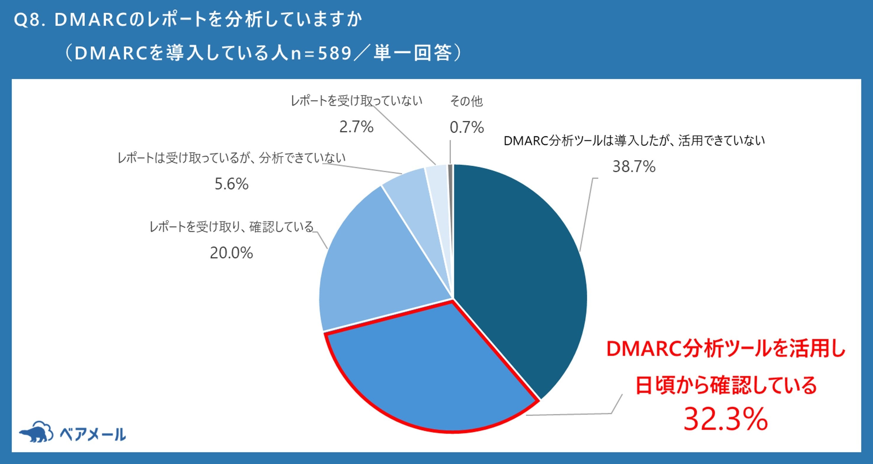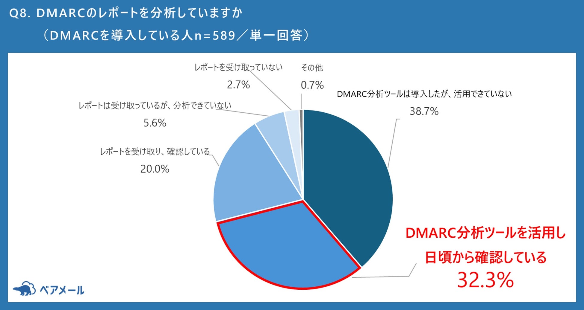 その一方で、「分析ツールを活用し、日頃から確認している」人は32.3%と、DMARCレポートの活用が進んでいる企業はまだ多くないことが明らかになった。