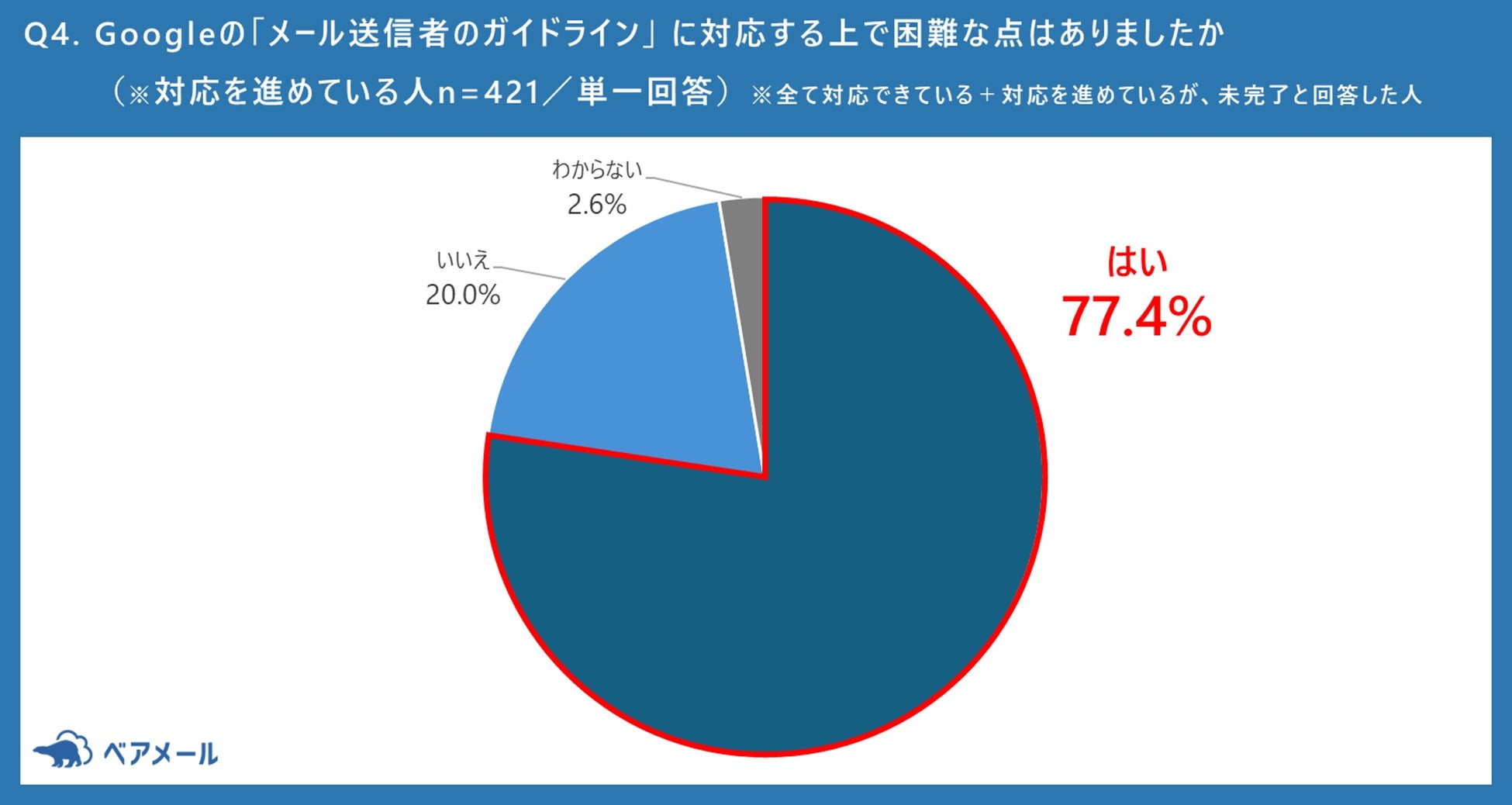 Googleの「メール送信者のガイドライン」に「全て対応できている」「対応を進めているが未完了」と答えた人にガイドラインへの対応を進める上で困難な点があったか聞いたところ、約8割(約77.4%)が「ガイドラインに対応する上で困難な点があった」と回答しました。