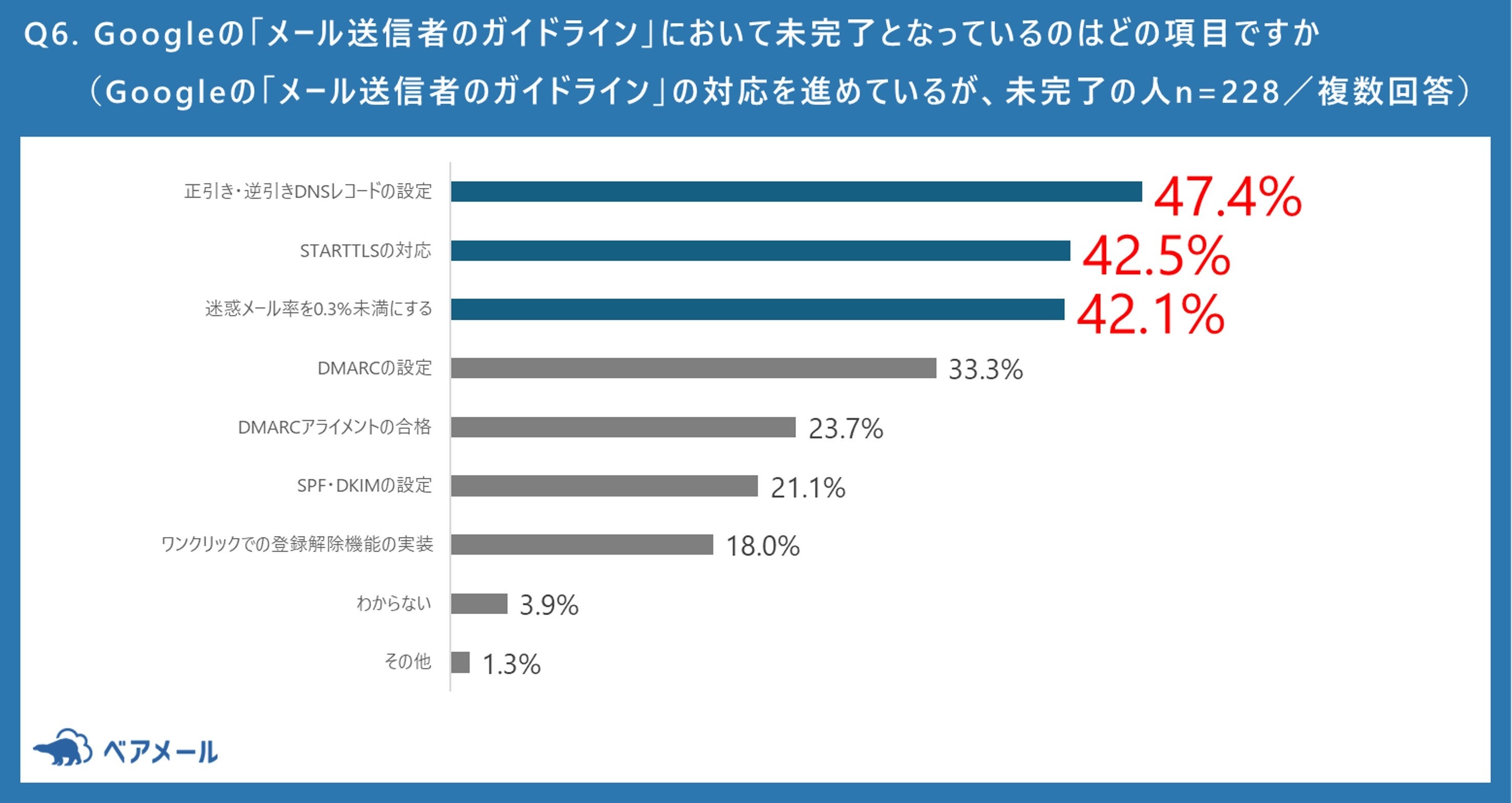 ガイドライン対応の未完了項目について確認したところ、「正引き・逆引きDNSレコードの設定」が約半数(47.4%)で最も多く、「STARTTLSの対応」が42.5%、「迷惑メール率を0.3%未満にする」が42.1%となりました。注目されたSPF・DKIM・DMARCといった送信ドメイン認証への対応よりも、DNSの正引き・逆引きの設定やSTARTTLS対応が意外な落とし穴となっていることがうかがえました。