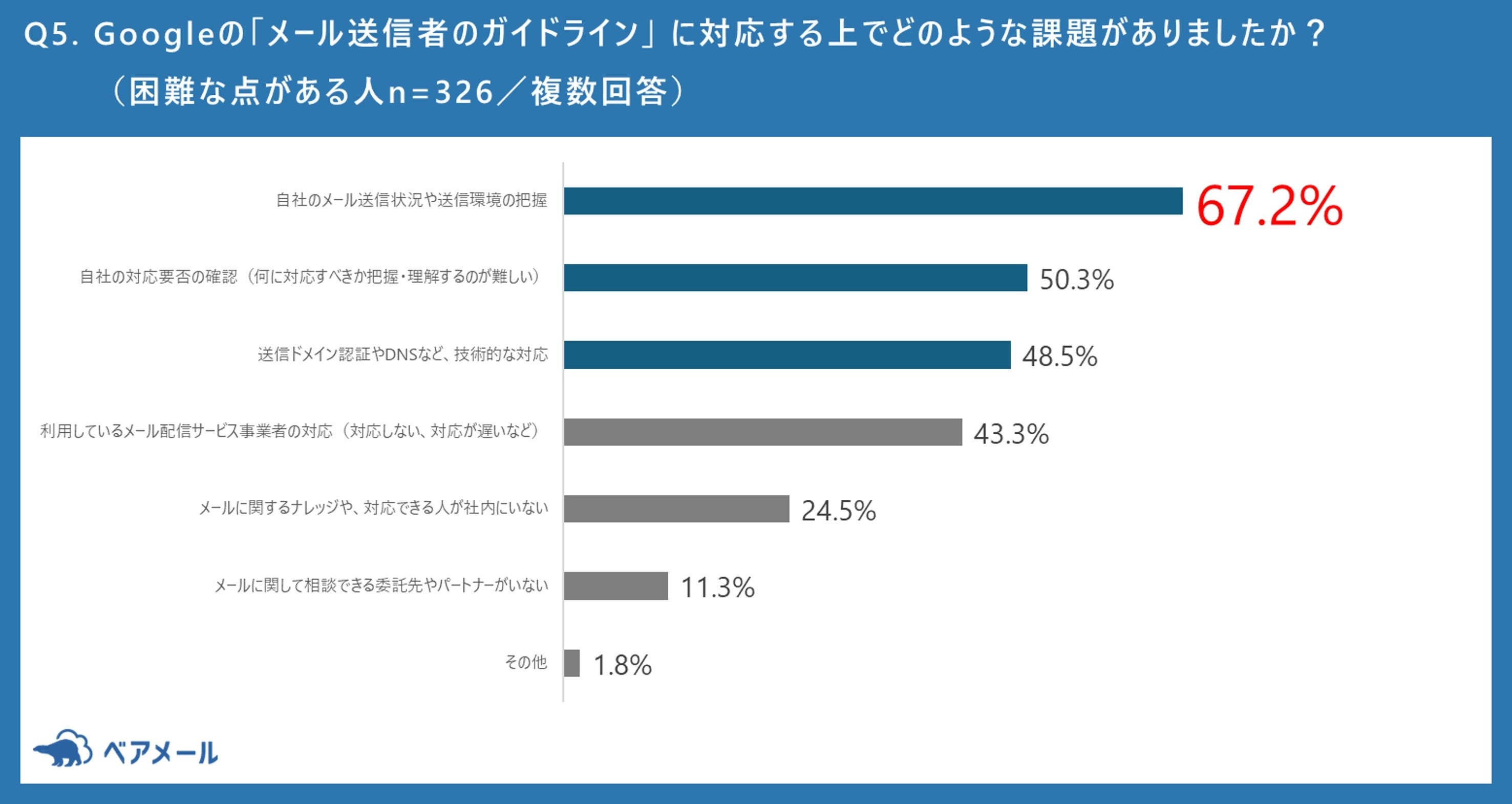 課題となった点については、「自社のメール送信状況や送信環境の把握」が67.2%で最も多く、次いで「自社の対応要否の確認(何に対応すべきか把握・理解するのが難しい)」が50.3%、「送信ドメイン認証やDNSなど、技術的な対応」は48.5%と3番目になっており、技術的対応以前に自社のメール利用の状況把握に困難を覚えている様子が見受けられました。