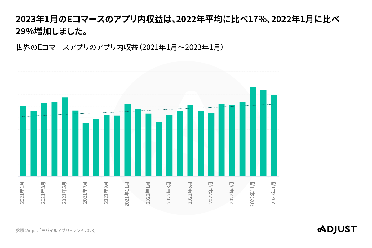 - Mコマース(モバイルコマース)の収益が一貫して増加:2022年、Mコマースはセッション数、アプリ滞在時間ともに前年比増を達成し、2023年の現時点では、セッション数がさらに7%増となっています。Eコマースのアプリ内収益は2022年11月に前年比4%増を記録し、Adjustが計測を開始して以来最も大きく増加した月となりました。