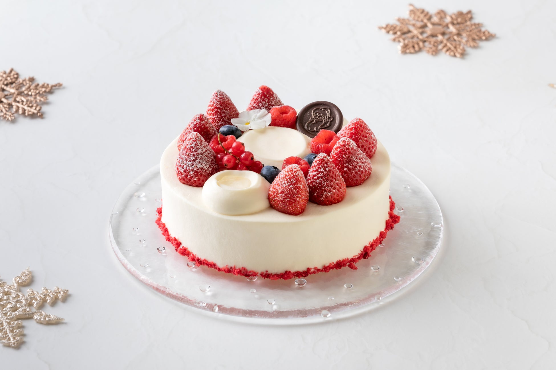 ペストリーシェフ大内浩司プロデュースによる軽めの低脂肪生クリームを使用し、毎年幅広い年齢層から好まれるさっぱりとした口どけを楽しんでいただけるよう仕上げています。真ん中の1層には、甘酸っぱい美味しさと食感を味わっていただけるよう半分にカットした苺を詰め込んでいます。粉雪が降ったような丸ごと苺とベリーたちを敷き詰めて、さらにトップにはエディブルフラワーとチョコレートをあしらいました。 (※写真は15cm)