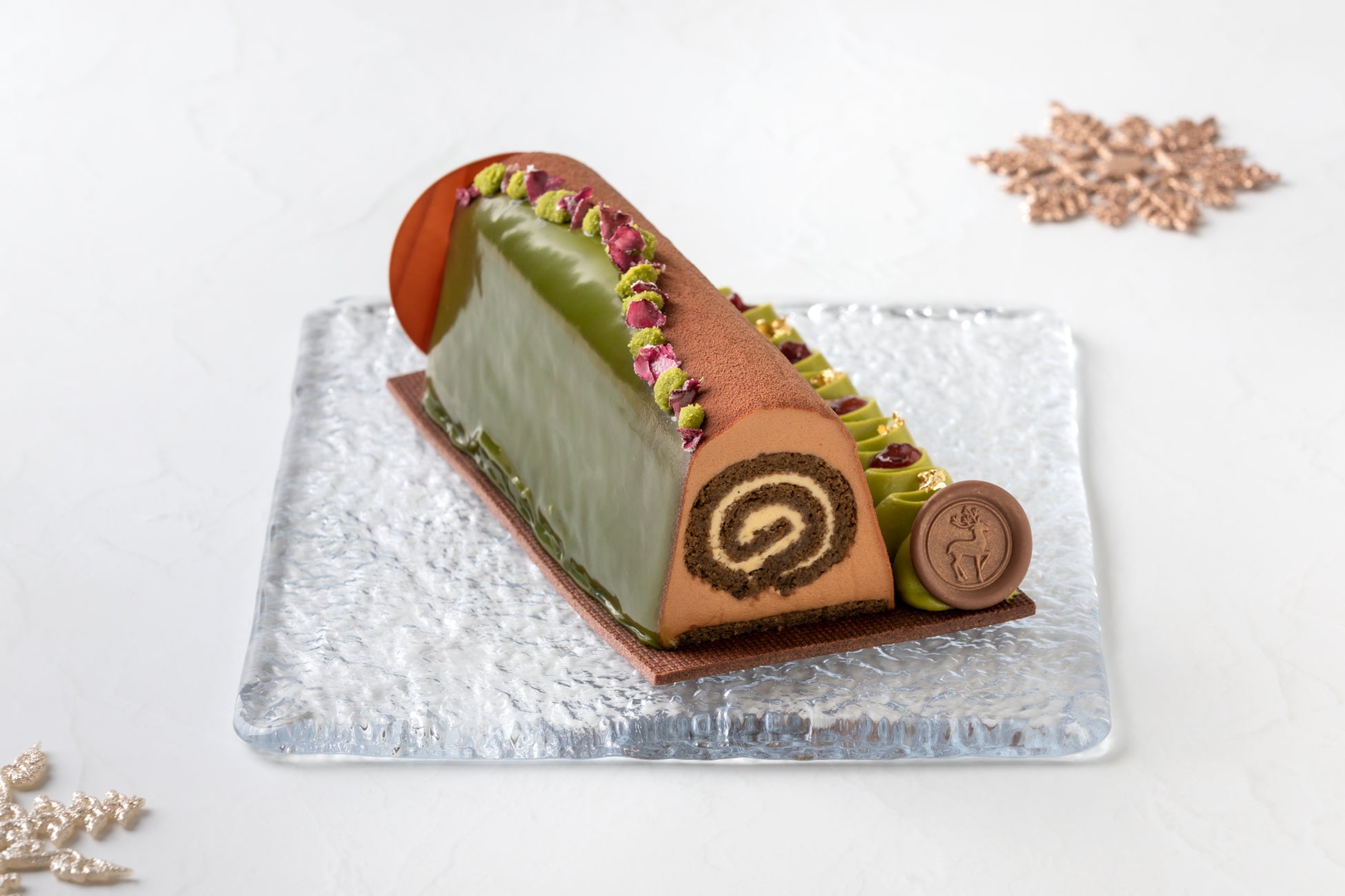 キャラメルを作る工程で、生クリームに入れたほうじ茶をゆっくりと煮出し、まろやかなミルクチョコレートと合わせると、キャラメルの苦味とほうじ茶特有の香ばしさが程よい、ほうじ茶キャラメルムースに仕上がります。そして、まるで小さな木々が立ち並んだように添えられた、クリスマスカラーが鮮やかな抹茶クリームは、カスタードクリームとバタークリームに、抹茶チョコレートとさらに抹茶パウダーを加え、味わい深いムースリーヌクリームにしました。ぜひご一緒にお皿にのせてお召し上がりください。
