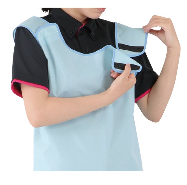 → 着用は頭と腕を通すだけ、脱ぐのは肩のスナップボタンを外すだけで完了。入浴介助後も濡れずに素早く脱ぐことができます。