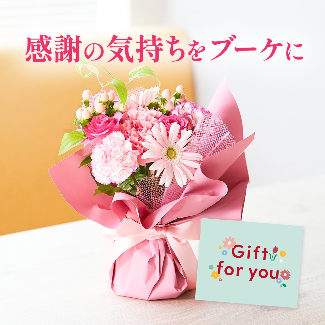 「はじめての親孝行ブーケ」は、「感謝」や「親への愛情」を花言葉にもつピンク色のガーベラ/カーネーションなどを厳選し、花瓶がなくてもそのまま飾れるデザインのブーケに仕上げました。