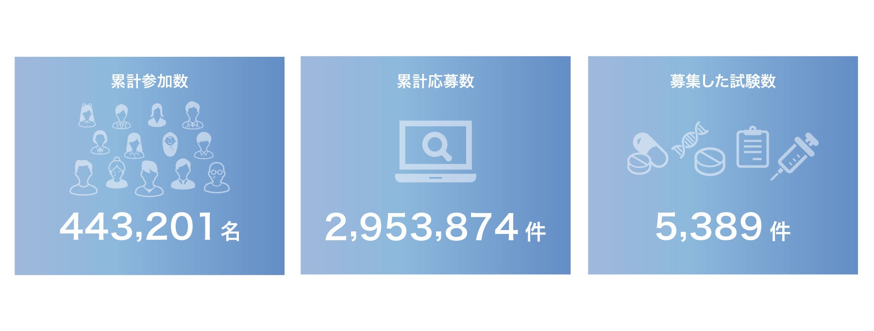「生活向上WEB」は、日本最大級の会員数を誇る治験情報サイトです。2005年から17年間で443,201名の方に試験にご参加いただき、5,389件の研究開発にご協力いただいております。近年では、ワクチンや治療薬といった新型コロナに関する治験などの研究開発に「生活向上WEB」を通して4万人が応募し、2022年7月末現在で2,437名の方にご協力いただきました。