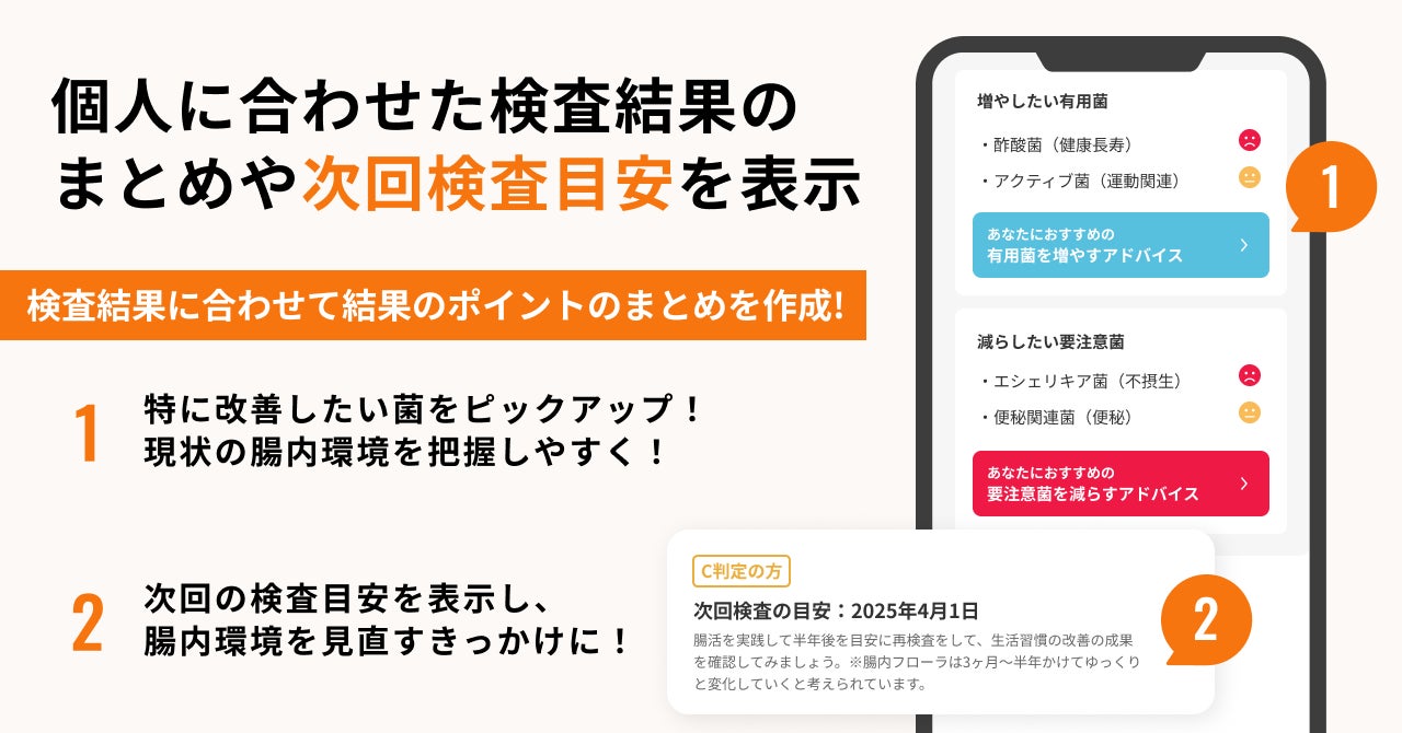個人の検査結果に合わせたまとめを作成。特に改善したい菌をピックアップし、腸内環境の現状を把握しやすい内容に。また、自身の目的や健康状態に合わせて繰り返し腸内環境を見直すきっかけになるよう、次回の検査目安を表示しました。