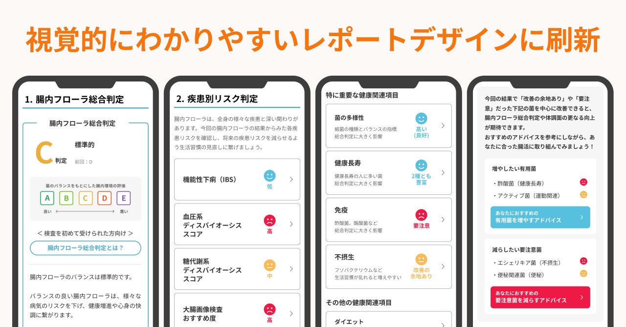 検査結果の内容をもとに、特におすすめの食材や一日あたりの摂取量の目安、日常生活に取り入れやすい具体的な腸活アクションを表示することで、より具体的で生活習慣の改善に役立つ検査サービスへと進化しました。