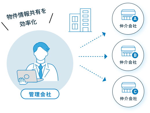 管理会社と仲介会社、双方における業務効率化を支援。24時間年中無休で物件情報の共有ができるので管理会社・仲介会社との情報共有を効率化できます。