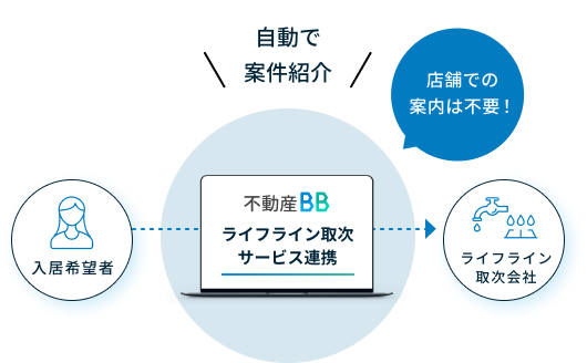 入居者とライフライン取次会社を自動で繋ぐので手間を掛けずに付帯収益を得ることができます。店舗での入居希望者へのライフライン契約の案内業務や、ライフライン取次会社への電話・メール・FAXによる取次業務は一切必要ありません。