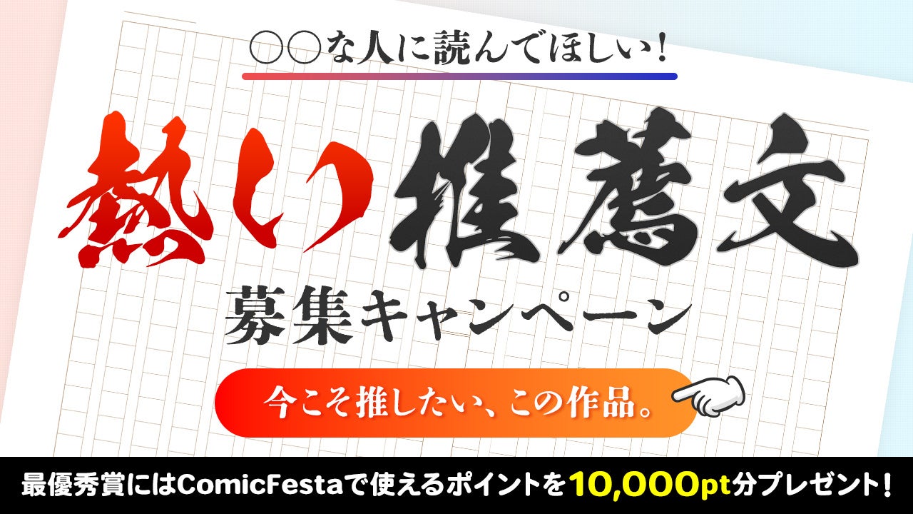 マンガファンの皆様、お待たせしました!ComicFestaでは、マンガを愛する全ての読者の皆さんに向けて、「〇〇な人に読んでほしい!熱い推薦文」募集キャンペーンをスタート!テーマに沿った心のこもった推薦文を大募集します。