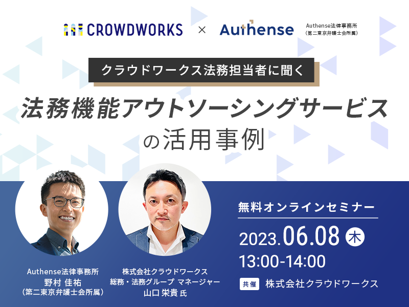 【無料ウェビナー開催2023.6.8】クラウドワークス法務担当者に聞く「法務機能アウトソーシングサービス」の活用事例|Authense法律事務所