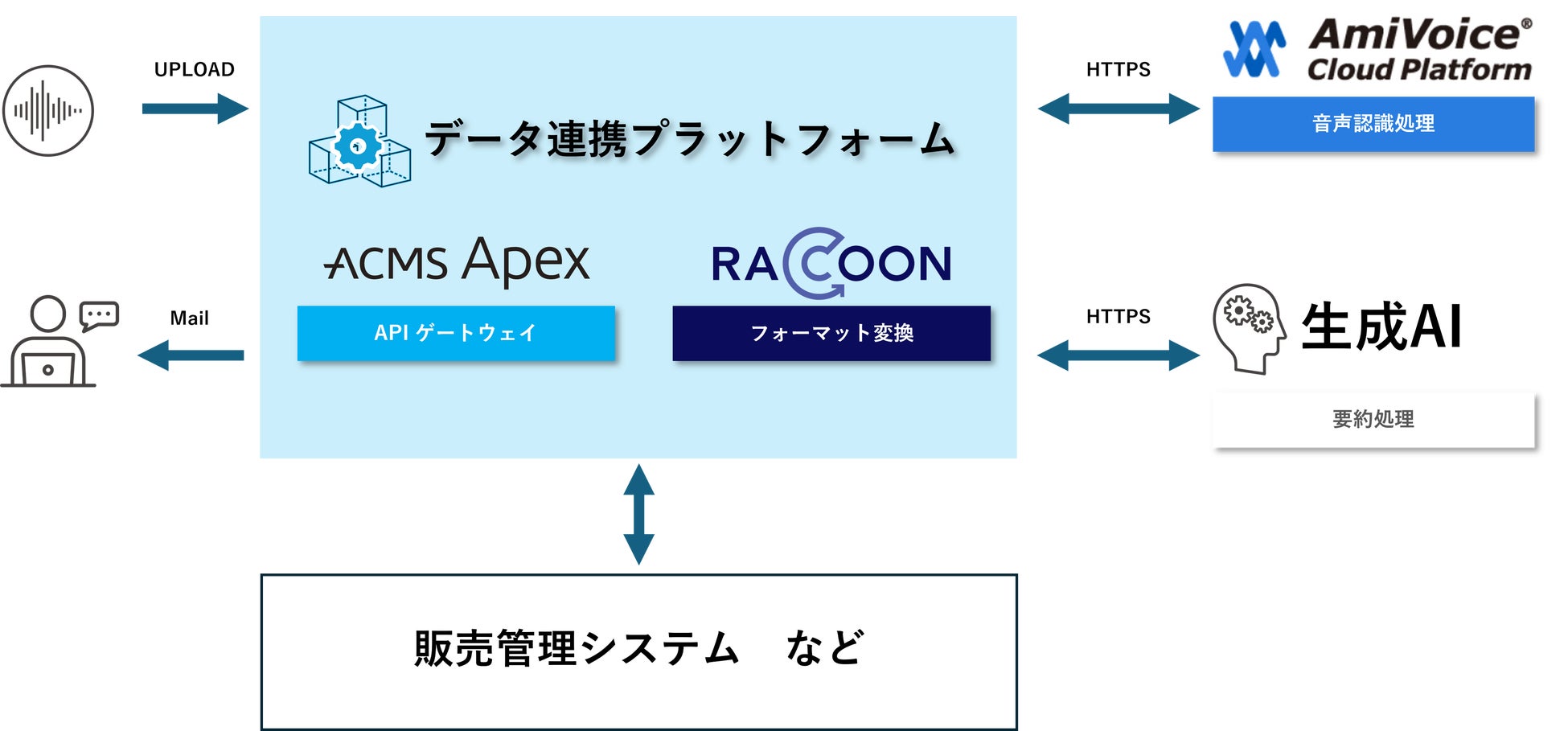 アドバンスト・メディアの開発者向け音声認識サービス「AmiVoice Cloud Platform(アミボイス クラウド プラットフォーム)」にて提供している音声認識API「AmiVoice API」と、生成AIサービスとの連携により、会話の内容をデータ化します。また、販売管理システムとの連携には、DALのエンタープライズ・データ連携プラットフォーム「ACMS Apex(エーシーエムエス エイペックス)」およびデータ ハンドリング プラットフォーム「RACCOON(ラクーン)」を使用しており、音声のテキスト化、要約、注文請書の自動生成、買主へのメールによる送付を自動化しています。