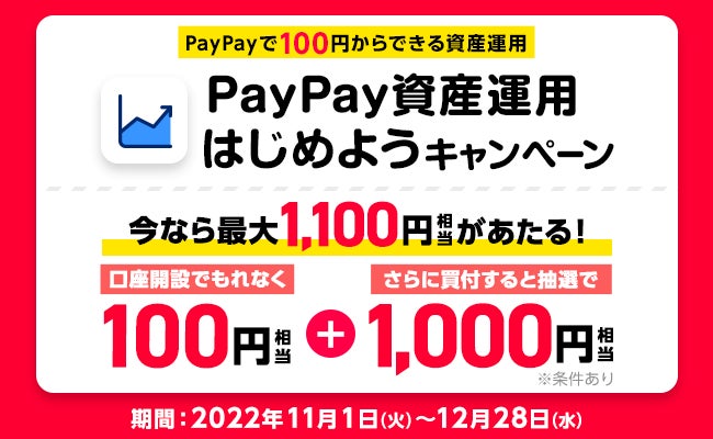 「資産運用を、より身近に。」をミッションに運営するスマホ証券、PayPay証券株式会社(東京都千代田区、代表取締役:番所 健児、以下PayPay証券)は、キャッシュレス決済サービス「PayPay」内のミニアプリ(※1)で有価証券の売買が行える「PayPay資産運用」で「PayPay資産運用はじめようキャンペーン」の第2弾を2022年11月1日(火)から2022年12月28日(水)の期間に実施します。期間中、PayPay資産運用からPayPay証券の口座を新たに開設し、1,000円以上の買付を完了された方に最大1,100円相当をプレゼントします。