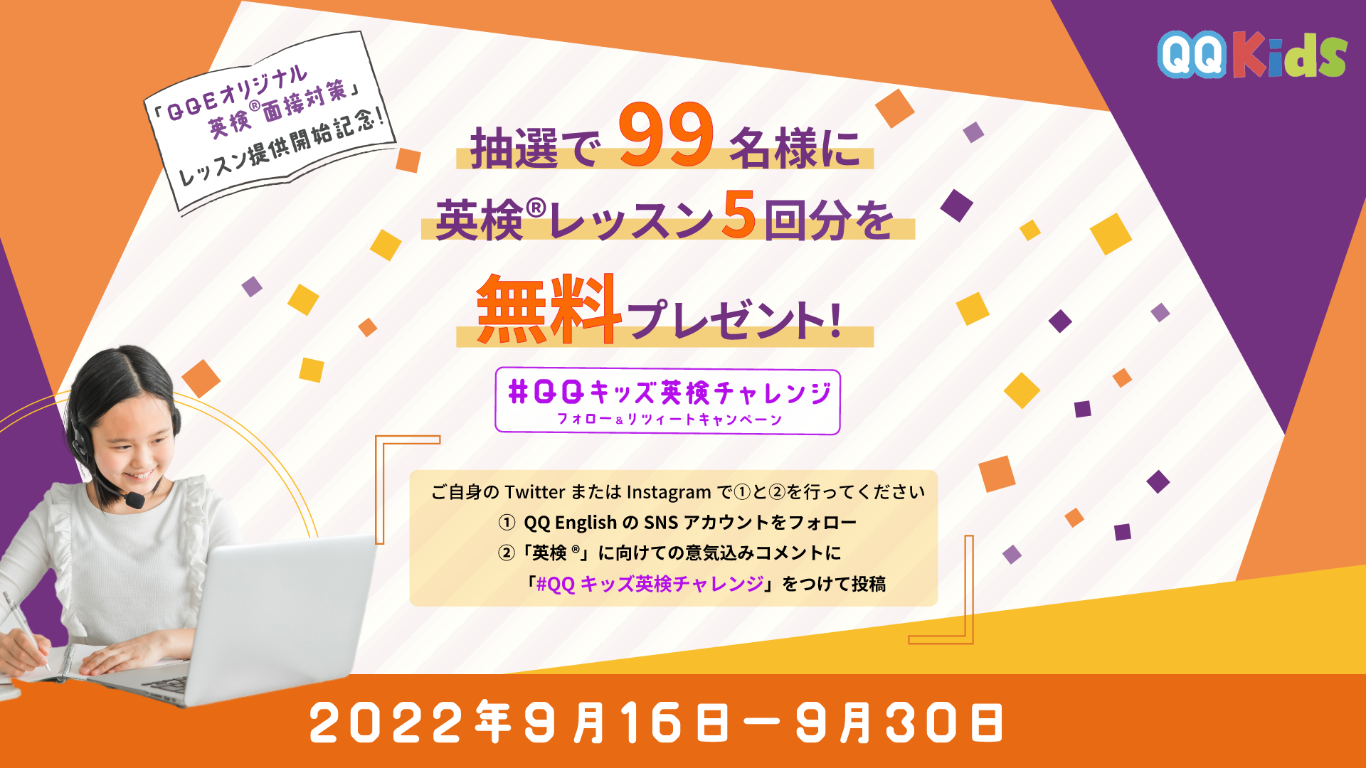 また、合わせて英検®レッスンの無料チケットを抽選99名にプレゼントする「#QQキッズ英検®チャレンジキャンペーン」を実施することをお知らせいたします。