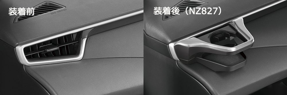 一般的なエアコン吹き出し口に取り付けのドリンクホルダーは、ドリンクを置いた際に助手席側のドアミラーが見 えなくなる場合があります。本製品はカローラシリーズ専用設計のため、助手席側ドアミラーの視界をさまたげな いような位置に設置できます。(下写真右:NZ830)