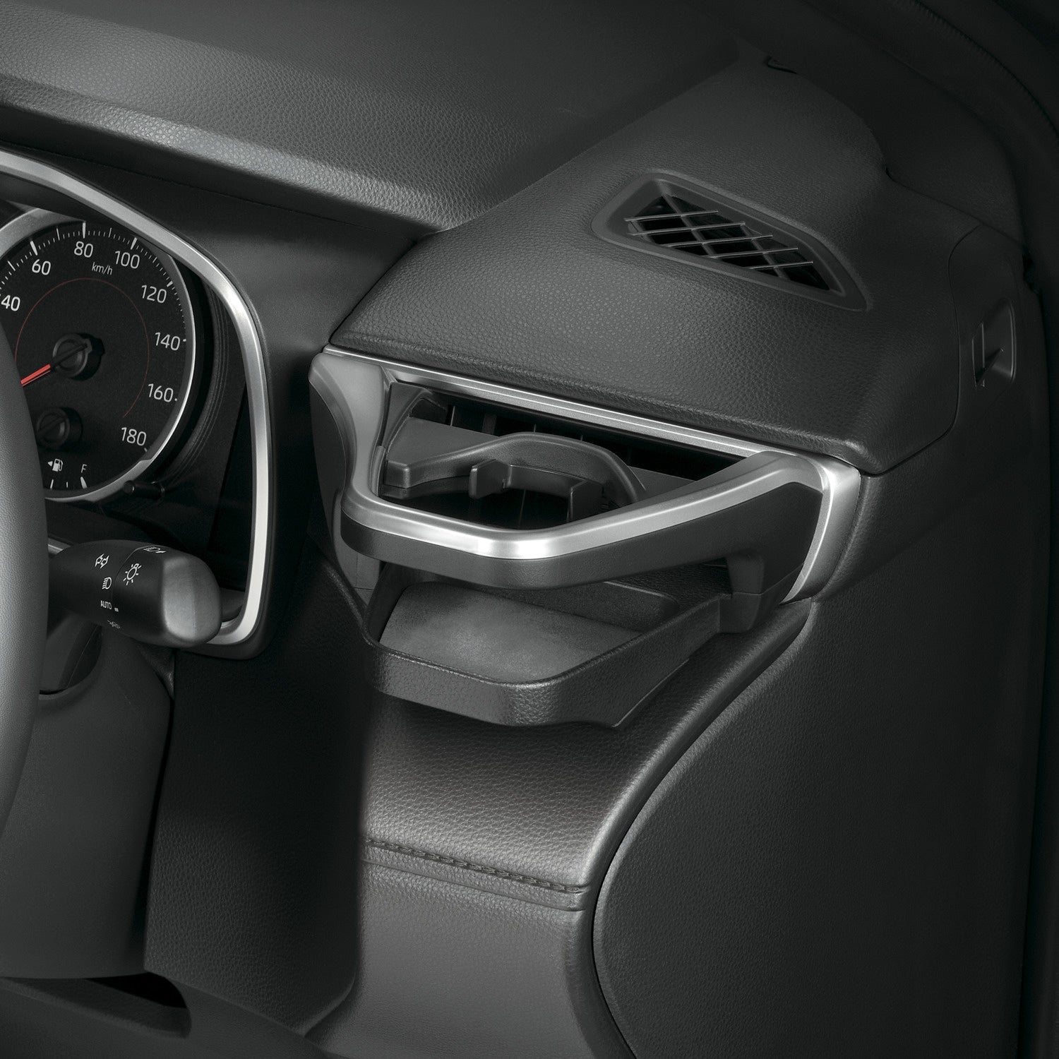 内装パネル表面の質感や色などに合わせた"まるで純正"を目指した作りこみにより、カローラシリーズの運転席および助手席周りと調和したデザインとなっています。上部のフレームはエアコン吹き出し口の形状にある面の流れを再現(下写真)、カラーは車種・グレードによって異なる吹き出し口の色に合わせています(詳細はスペック参照)。運転席と助手席ではインパネの素材が異なるため、それぞれ取り付け面に負荷がかからないよう取り付けベースの粘着テープの位置や厚さを変えています。