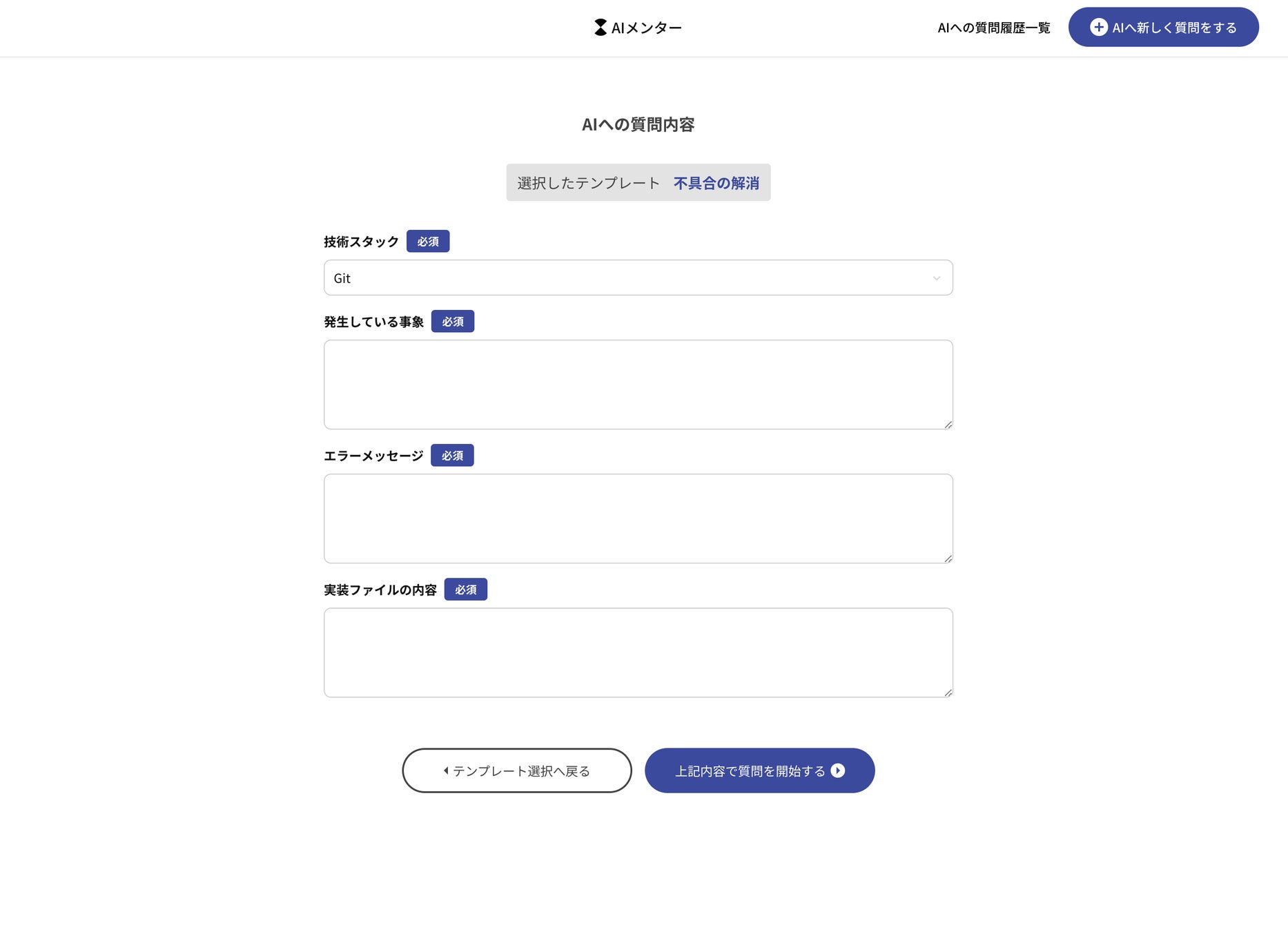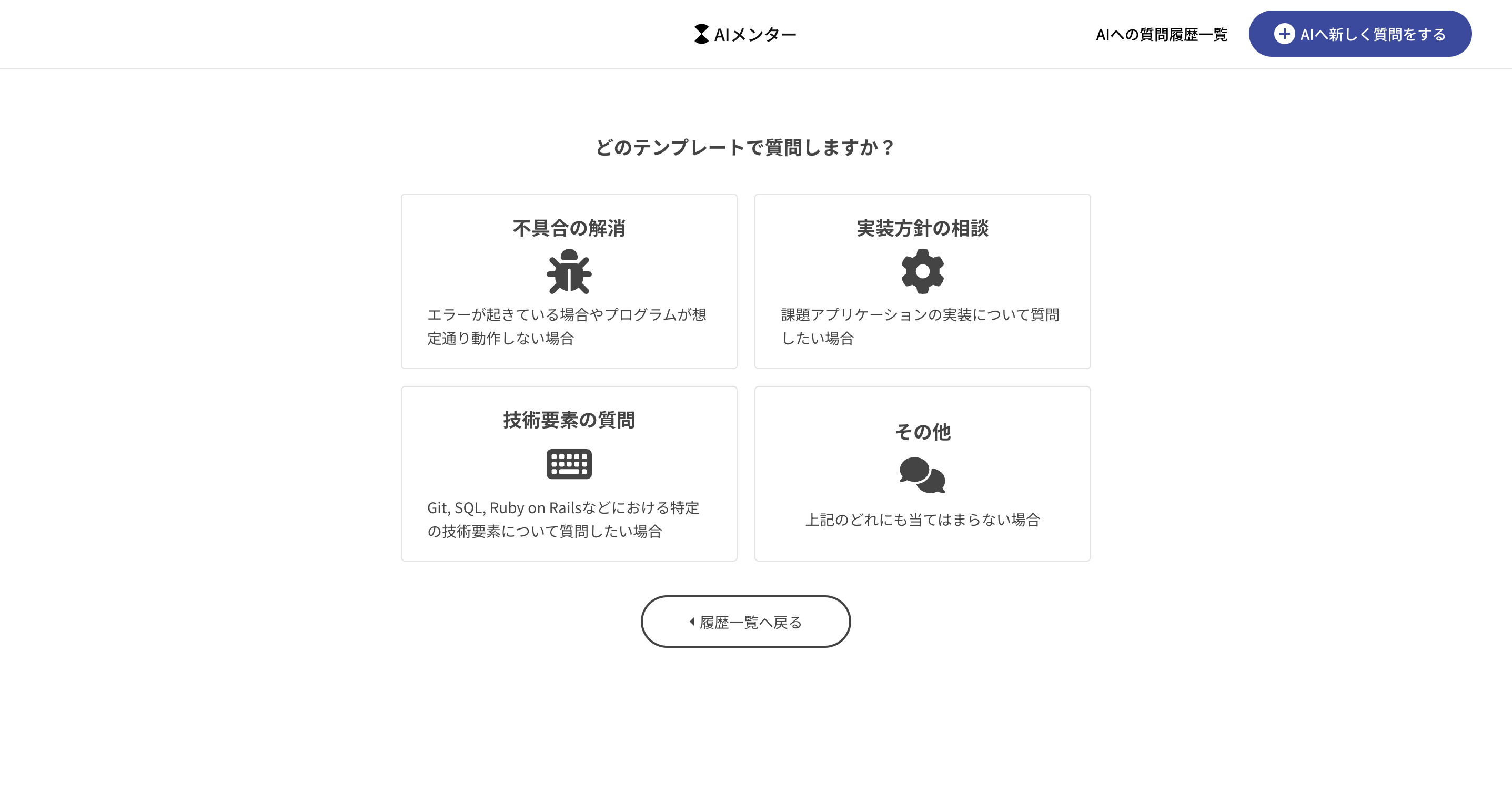 「不具合の解消」「技術要素の質問」など目的別にテンプレートを選択、利用しながら質問をすることでAIを初めて使用する方でも適切な回答を得られる設計になっています。テンプレートを利用しながらAIを活用することで、問題解決力を身につけながら学習をすることが可能です。