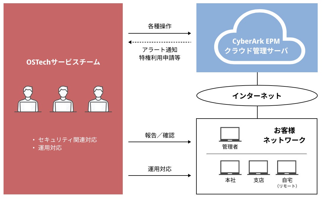 今回、運用を開始する「CyberArk EPMマネージドサービス」は、エンドポイント特権ID管理ソリューション(CyberArk EPM)を対象としたセキュリティ運用サービスです。OSTechがコンサルティング、導入をサポートし、その後の運用をOSCOMが担当。グループで包括して対応することによって一貫したサービスが提供可能となります。社内SOC(Security Operation Center)体制を整えるのが難しい企業様にとっては、社内リソースはそのままに、最新のエンドポイントセキュリティを適切に運用することが可能となります。