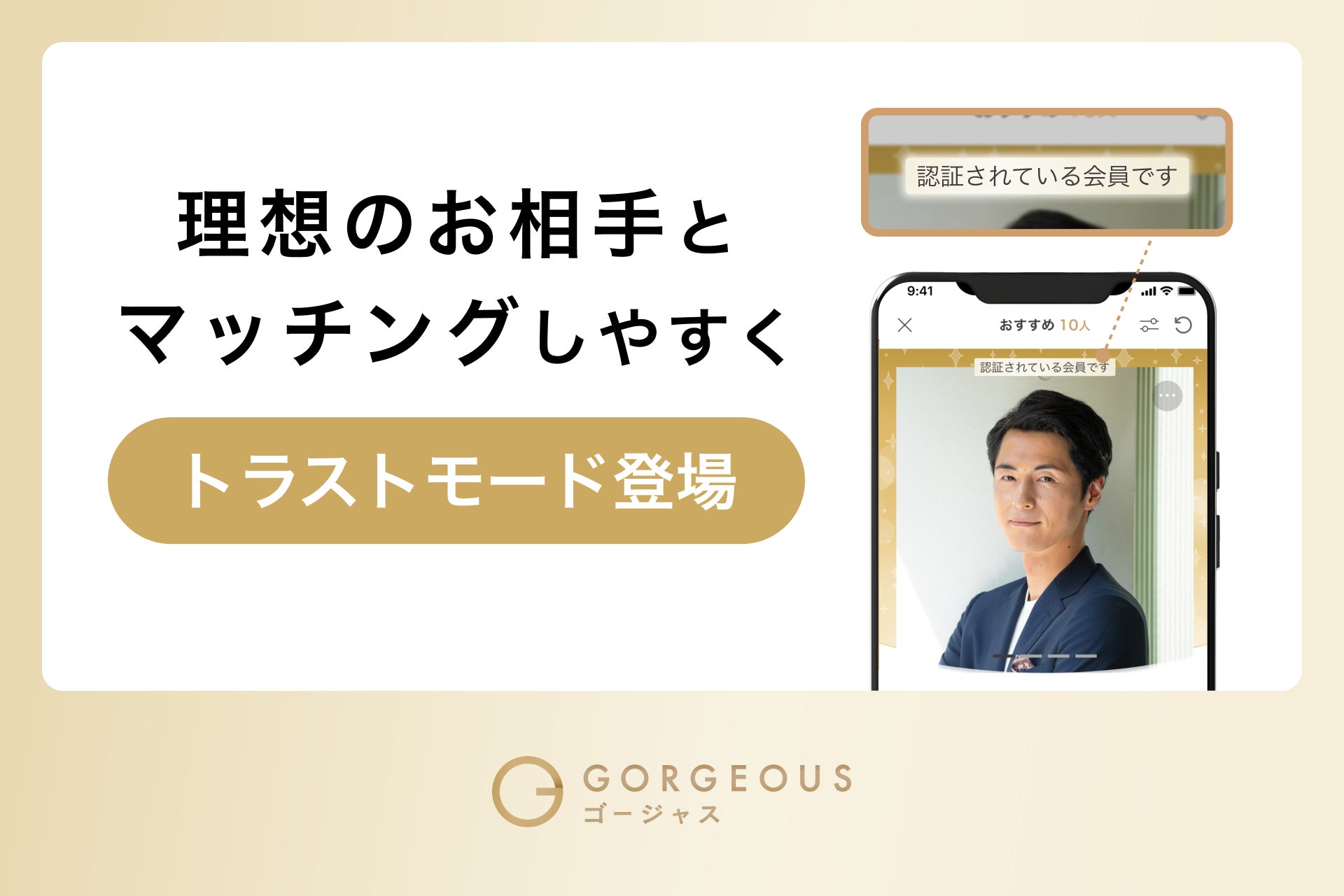 アイザック株式会社(本社:東京都渋谷区、代表取締役社長:田中和希)が運営する出会いの質にこだわった審査制恋活・婚活マッチングアプリ「ゴージャス」は、職業証明・年収証明済みの会員を対象に、理想のお相手とのマッチングを引き寄せる「トラストモード」の提供を開始します(※)。本機能の追加により、真剣な出会いを求めるみなさまへ、さらに安心・安全に理想のお相手と出会える機会を提供します。
