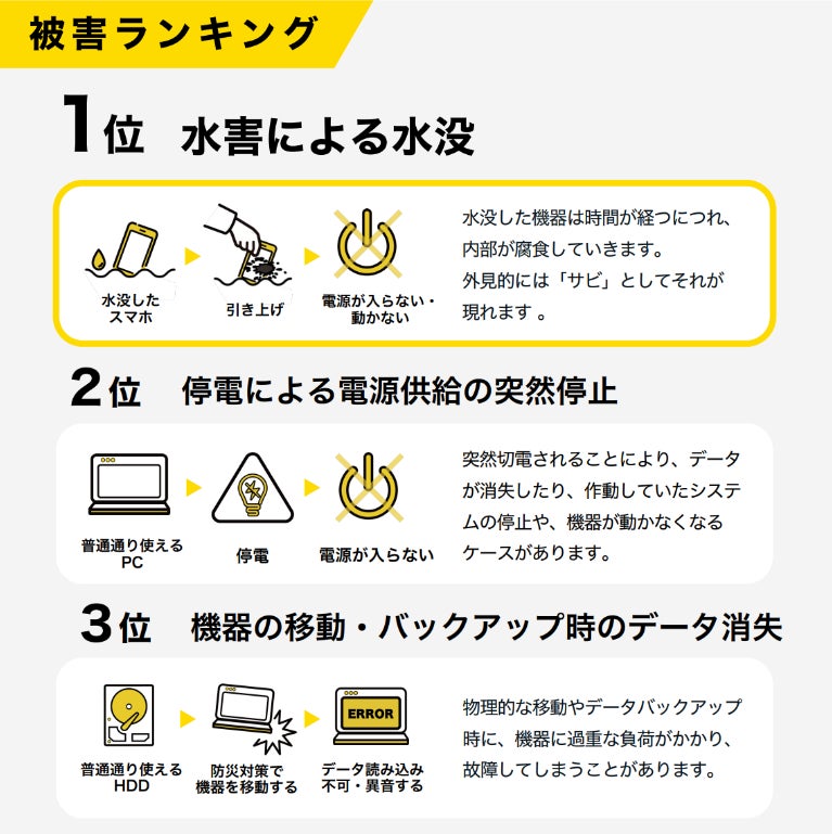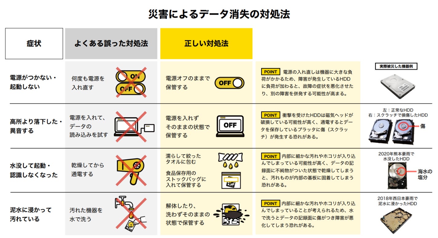 ガイドブック内では、自然災害でよくあるデータ消失例や、災害時の対処法を紹介しています。 地震による落下、津波や豪雨による水没、停電による電源停止など、症状によって対処法が異なります。