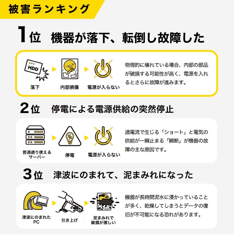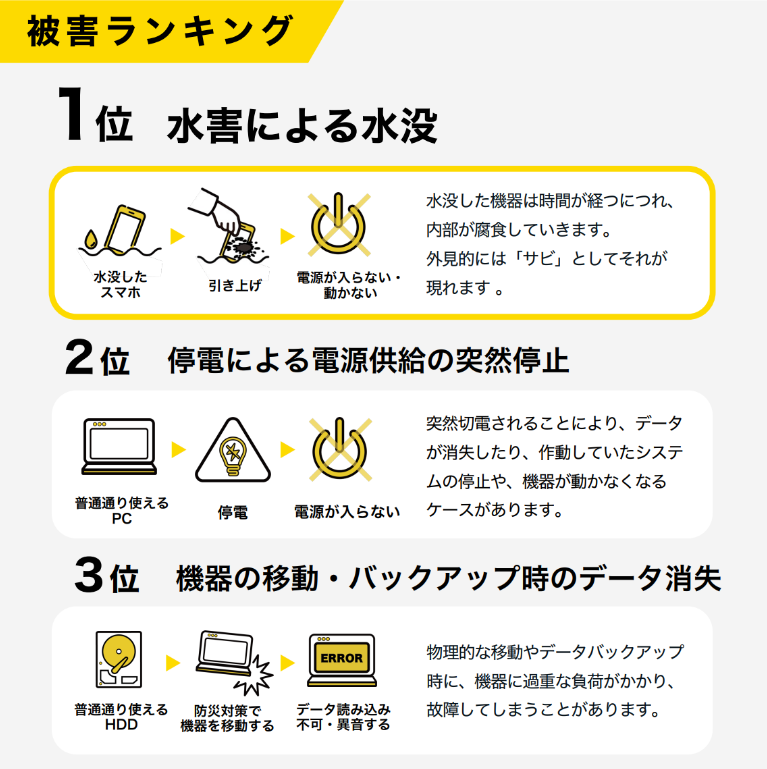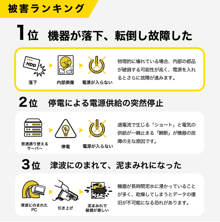 日本は世界有数の災害大国です。地震、豪雨、台風などによって、自治体・企業・各家庭のサーバー、HDD、パソコン、スマートフォンが故障し、思わぬところでデータが消失する被害が多く発生しています。