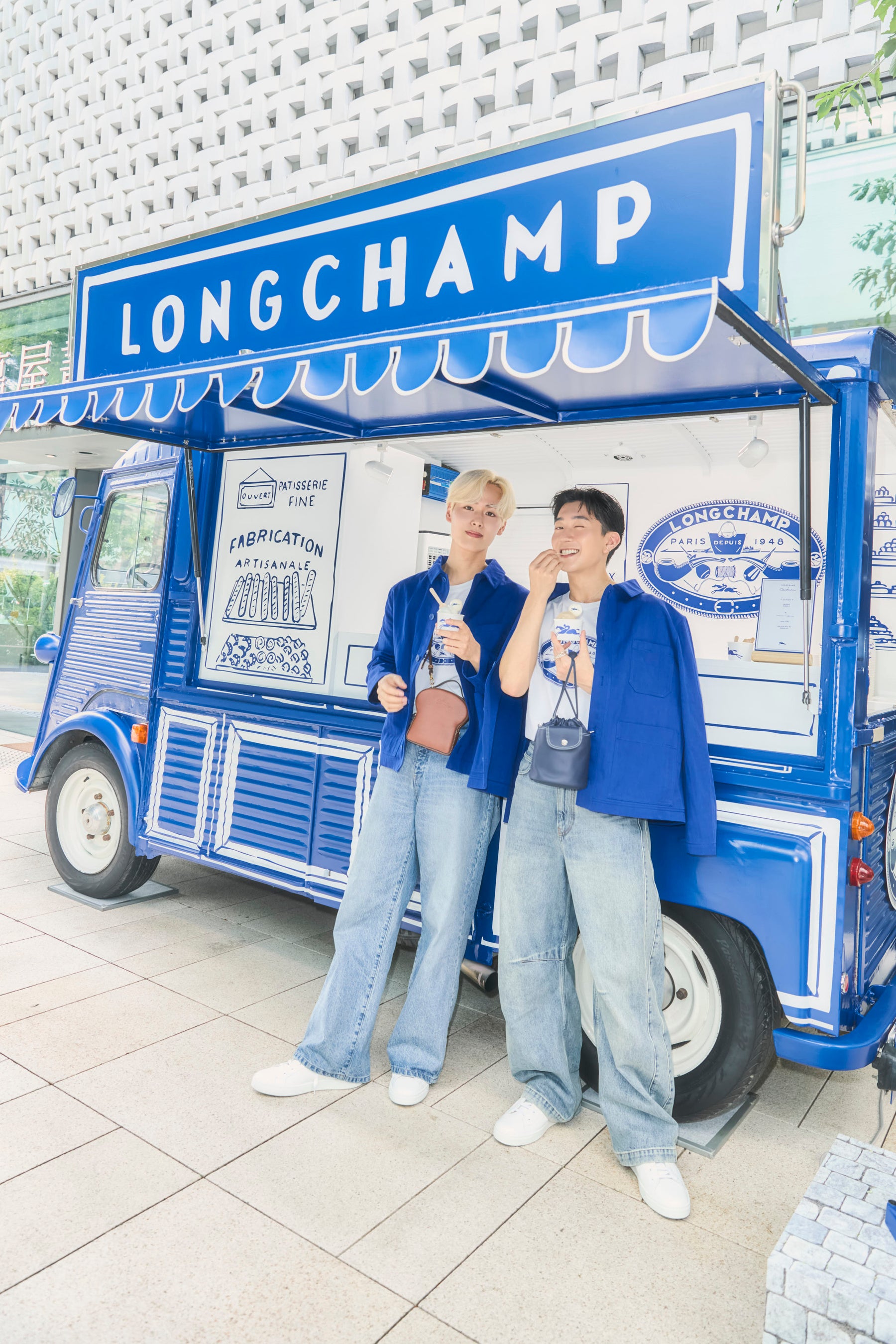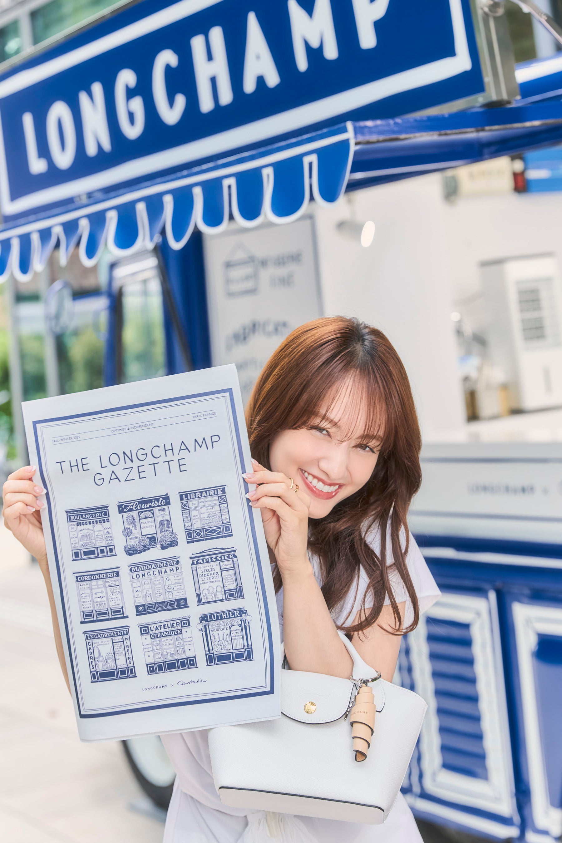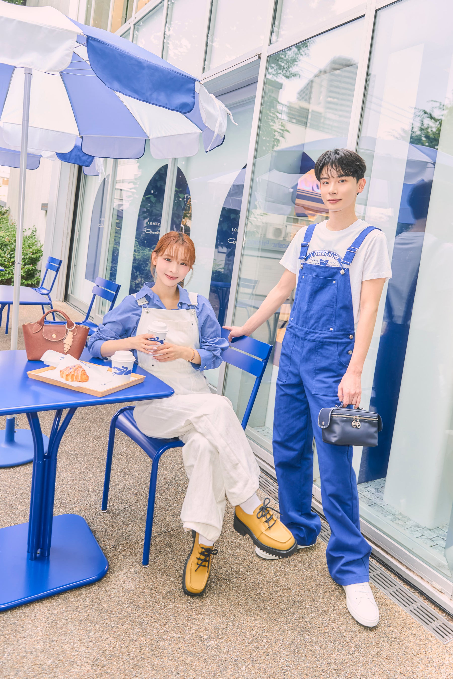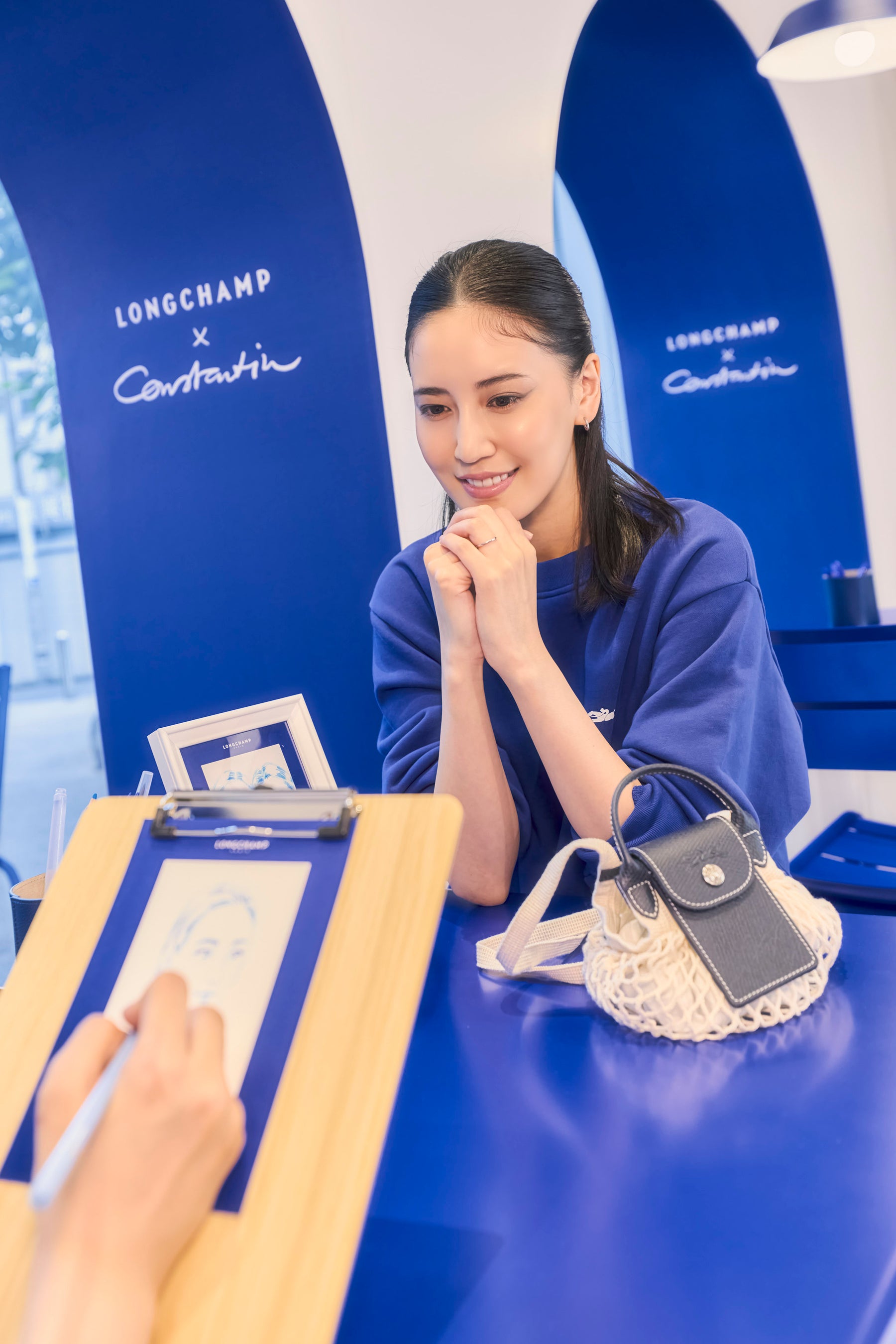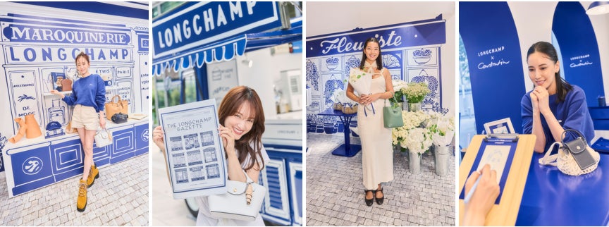 思い思いのロンシャン秋ルックや最新バッグを身に纏ったゲストが石畳を軽やかに進むと、コンスタンタンのシグネチャーカラーである青色で緻密に描き下ろされたトワルドジュイ(2色使いの情景)なパリが。ゲストは、ガゼット(新聞)を読んだり、大切な人を想って旬の花々を選んだり、ポストカードにちょっとした感謝の言葉を綴ったり、木漏れ日が優しく差し込むテラスで「クロワッサン トワルドジュイ」に舌鼓を打ったり、カフェで画家にさっとデッサンしてもらったり、街角で甘いグラース(アイスクリーム)をシェアしたりと、まるでパリにいるかのような瞬間を体験しました。
