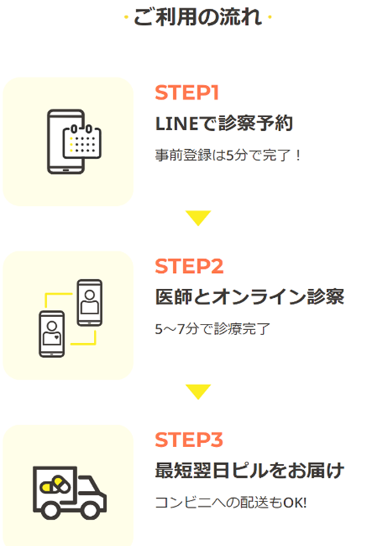 スマートフォンからLINEで簡単に登録・予約ができ、医師による丁寧なオンライン診療で自分に合ったピルを処方してもらうことができます。ピルは最短で翌日に届き、その後は指定した頻度でピルが届きます。