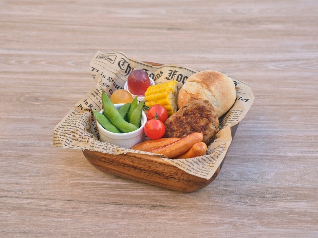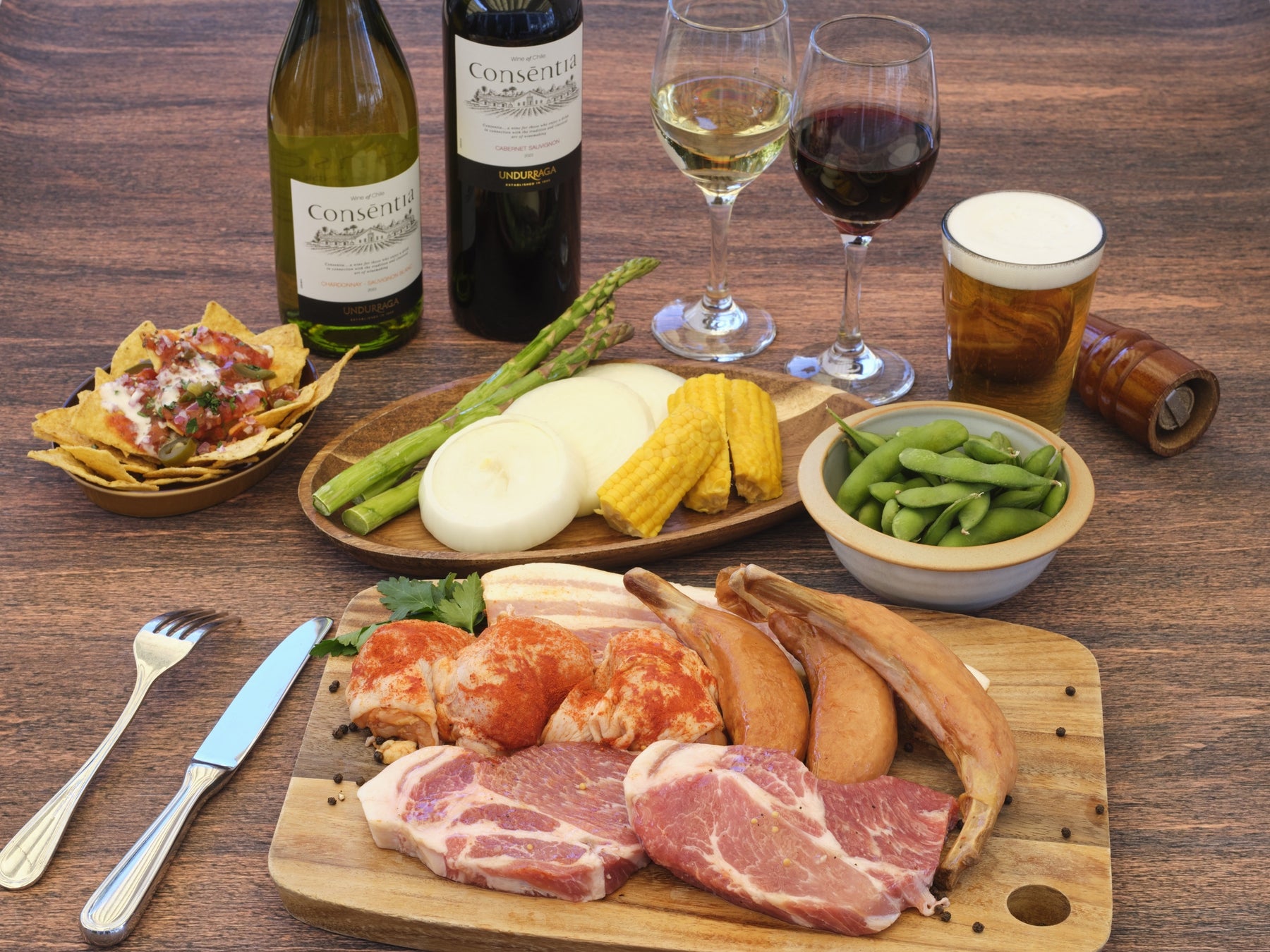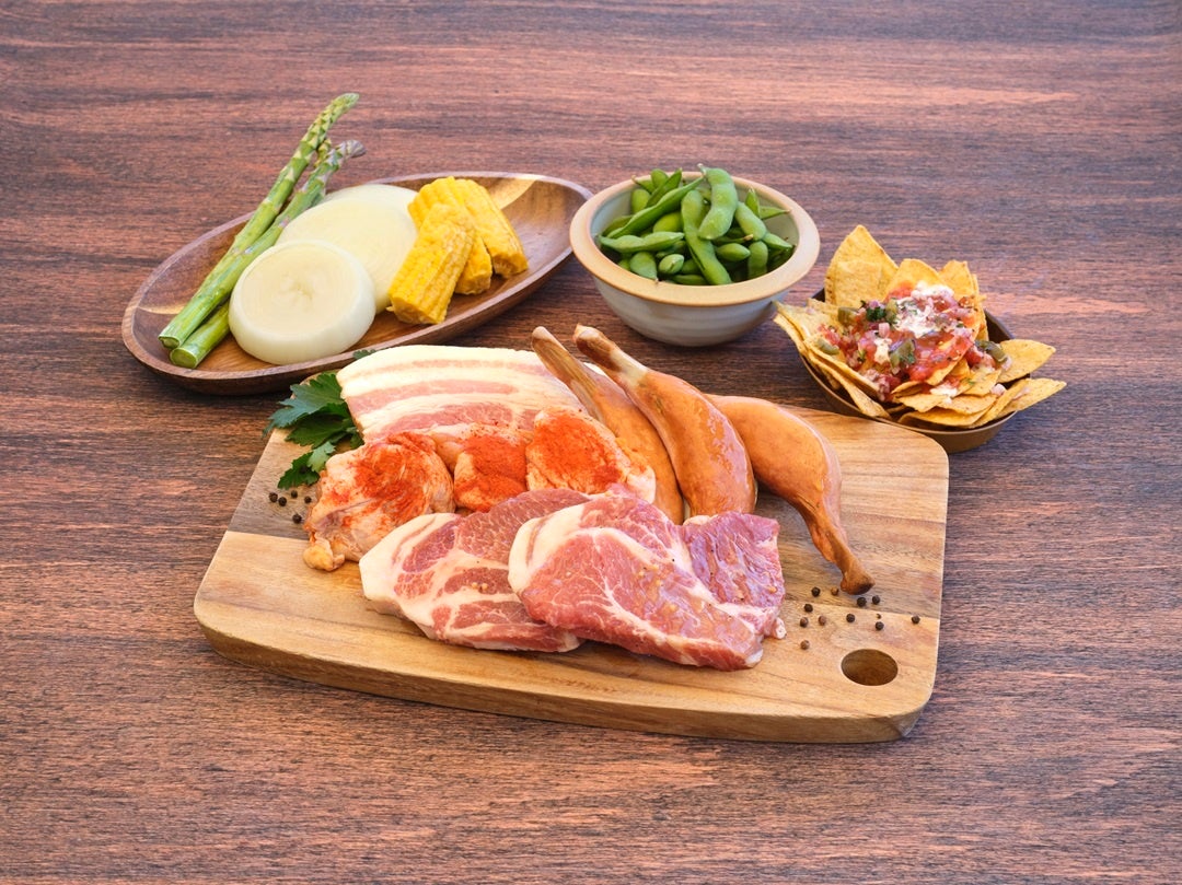 ■飲み放題120分付き ■プラン内容 [お肉]厚切りベーコン/熟成ポーク/ジャークチキン/骨付きソーセージ [野菜]スイートコーン/グリーンアスパラ/玉ねぎ [タパス]枝豆/スパイシーナチョス |
