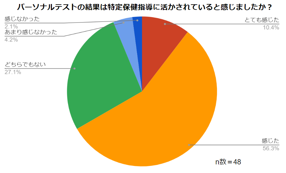 「パーソナルテスト」を試験導入した健康保険組合では、7割近い受講者(対象者)方が「パーソナルテストの結果は保健指導に活かされている」と回答しました。オンラインコーチは対象者の性格や特質を事前に把握できることで、指導準備をしやすくなります。また、オンラインコーチがスムーズに指導に入り、コミュニケーションを円滑にとることで、対象者からの安心や信頼を得やすくなります。