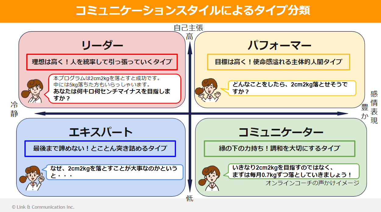 臨床心理学や組織行動学などをベースに、当社が独自に開発した「パーソナルテスト」(10問程度)に回答して頂くことで、コミュニケーションスタイルを「リーダー」「パフォーマー」「エキスパート」「コミュニケーター」の4タイプに分類します。オンラインコーチは、対象者のタイプに合わせた声のかけ方や目標設定を行うことで、コミュニケーションの幅を広げることができます。