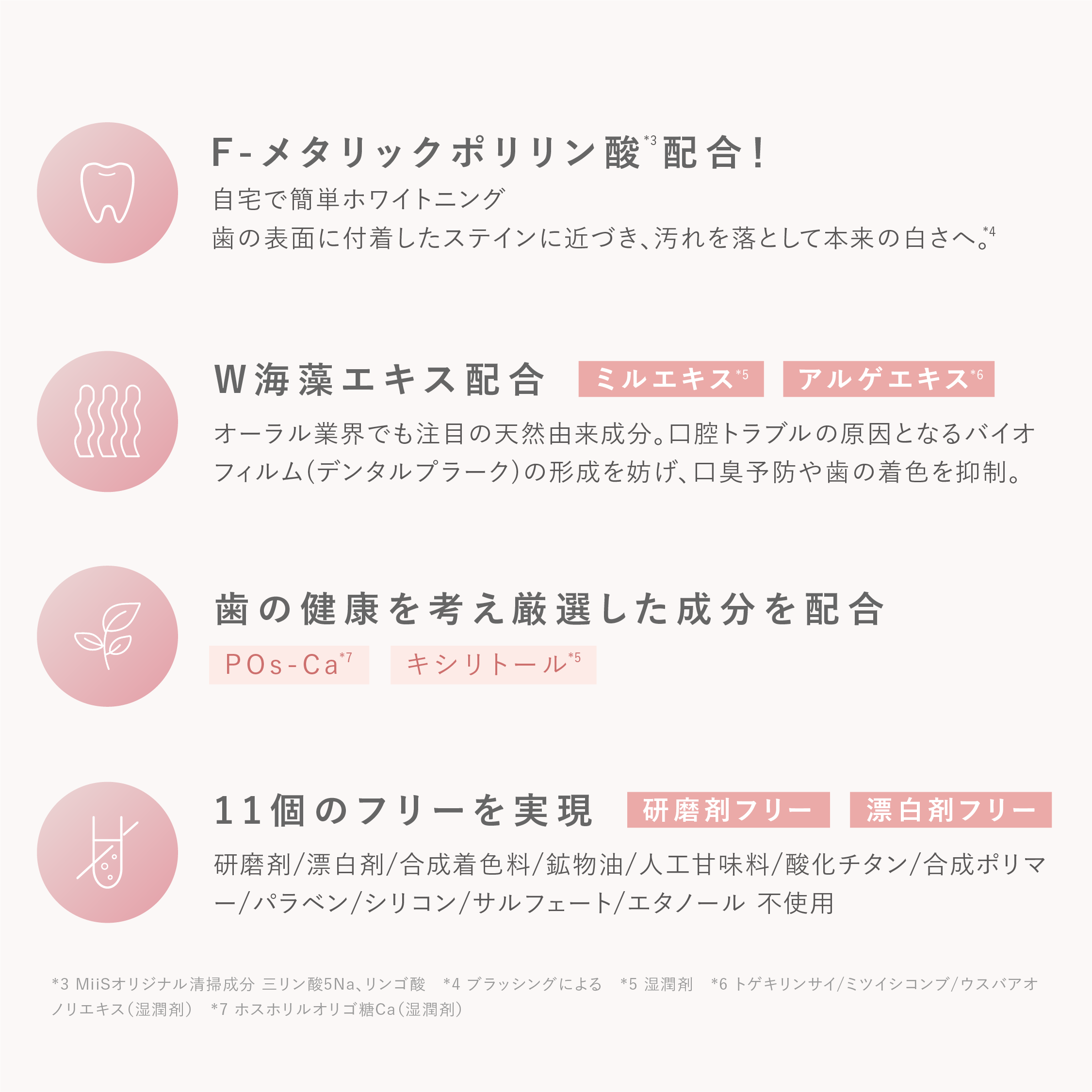 MiiSは、「オーラル美容を広めて、人々の人生を輝かせるエッセンスになる」というミッション実現に向け、商品の見た目だけでなく、成分にも徹底的にこだわり続け、歯も、息も、笑顔も、みなさんの輝く瞬間をつくるあたらしい美の習慣「オーラル美容」を提案しています。