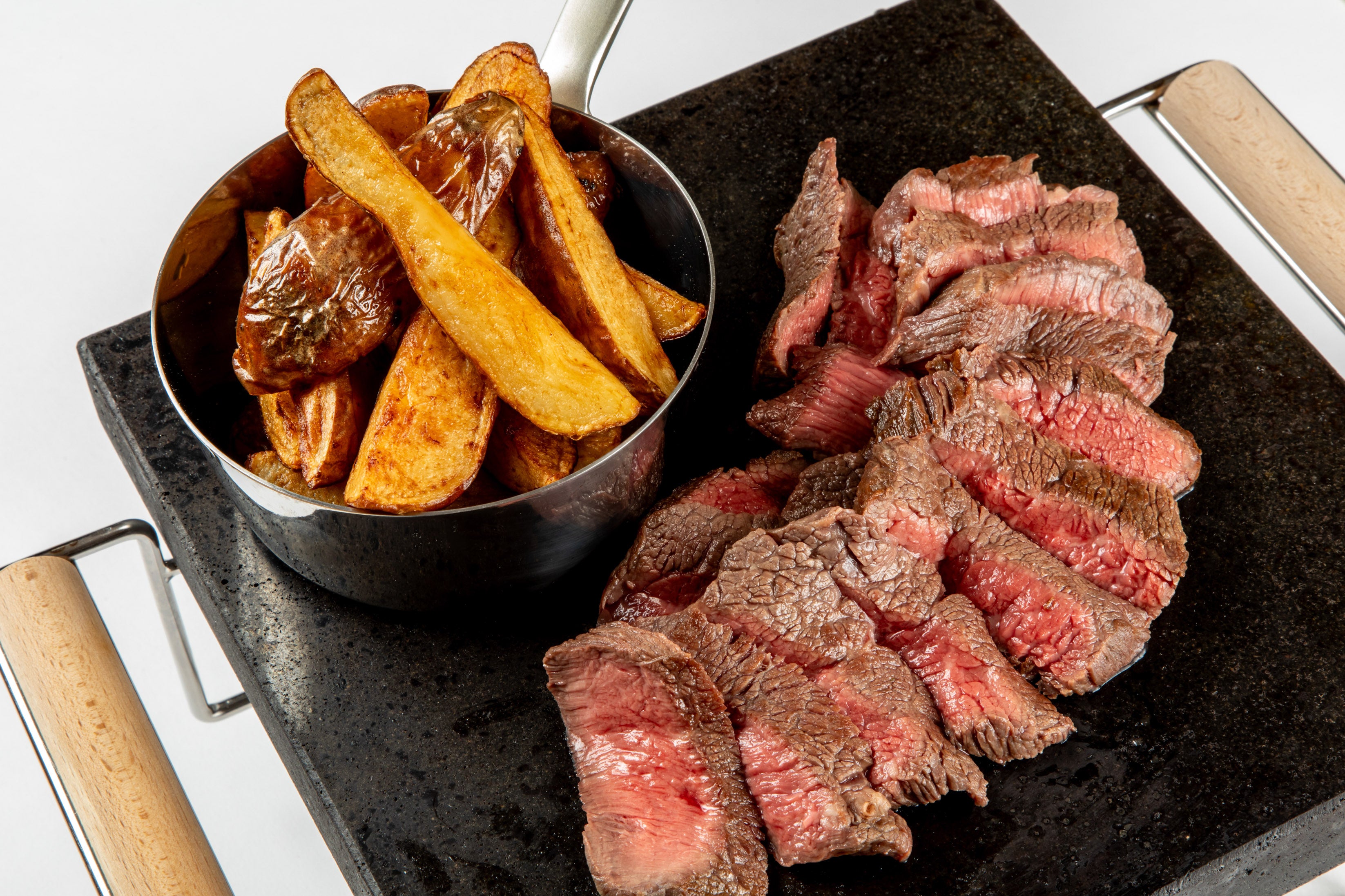 300°のオーブンで熱した天然石の上にブルーレアの状態のステーキを載せて提供します。