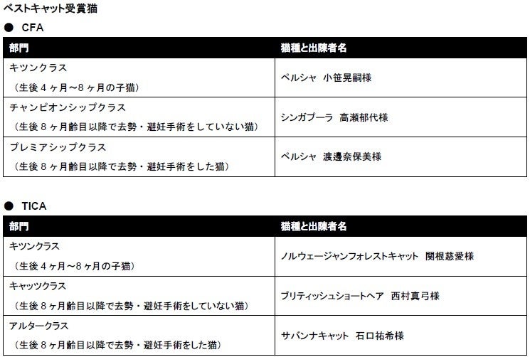 - 日本で唯一、CFAとTICAのキャットショーを同時に楽しめる「ジャパンキャットショー」 6頭の猫が栄えあるベストキャットに選出