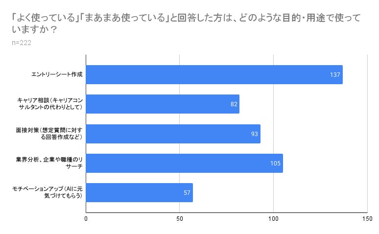 ・就職・転職活動でAIを使用する目的や用途としては、「エントリーシートの作成」が最多。続いて「業界分析、企業や職種のリサーチ」、「面接対策」、「キャリア相談」、「モチベーションアップ」の順番だった。