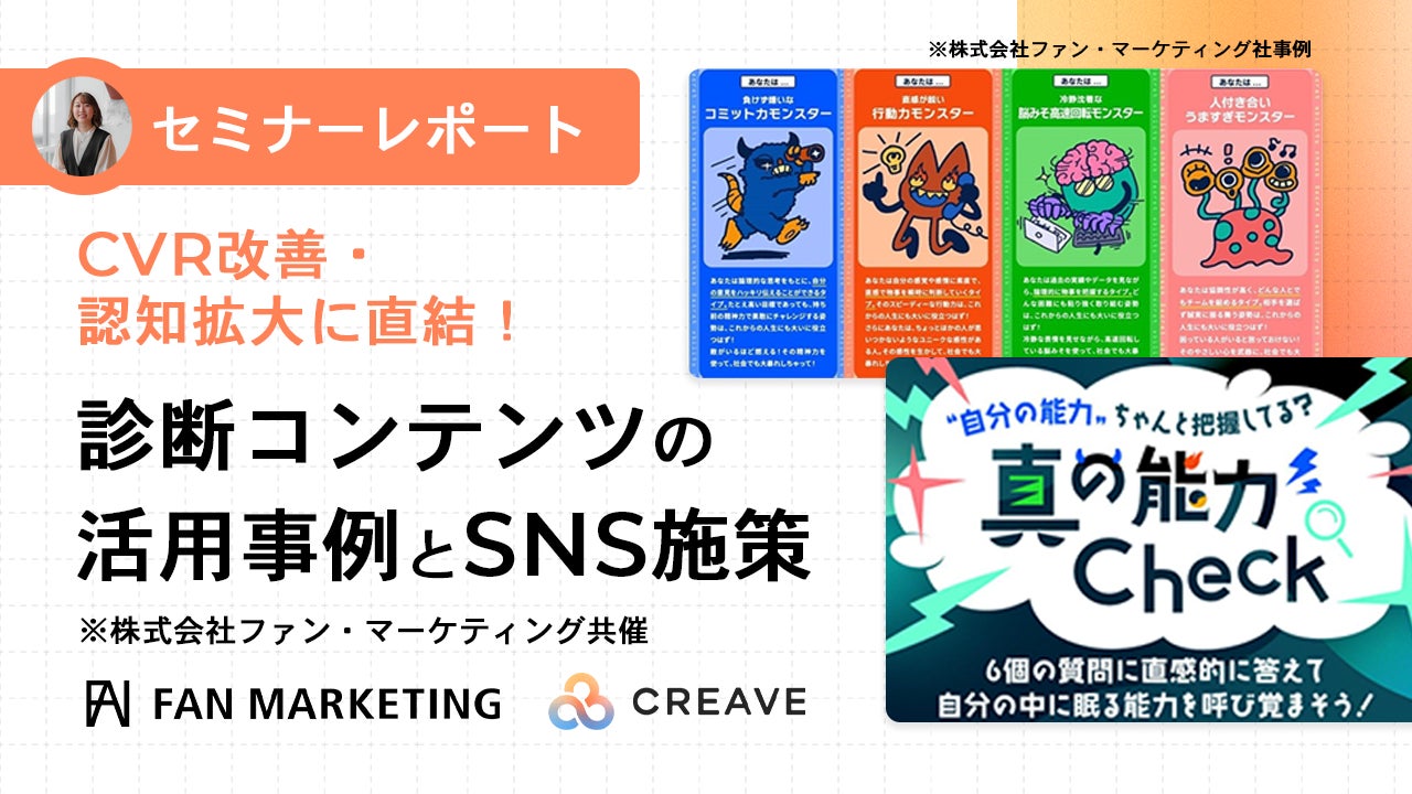 CREAVEは、マーケティング担当者様・広告代理店様向けに、株式会社ファン・マーケティングとの共催セミナー「CVR改善・認知拡大に直結!診断コンテンツの活用事例とSNS施策」を7月23日(火)に開催し、効果的なマーケティングに必要不可欠な”診断コンテンツ”で実現できることやリリース後のSNS拡散について解説しました。