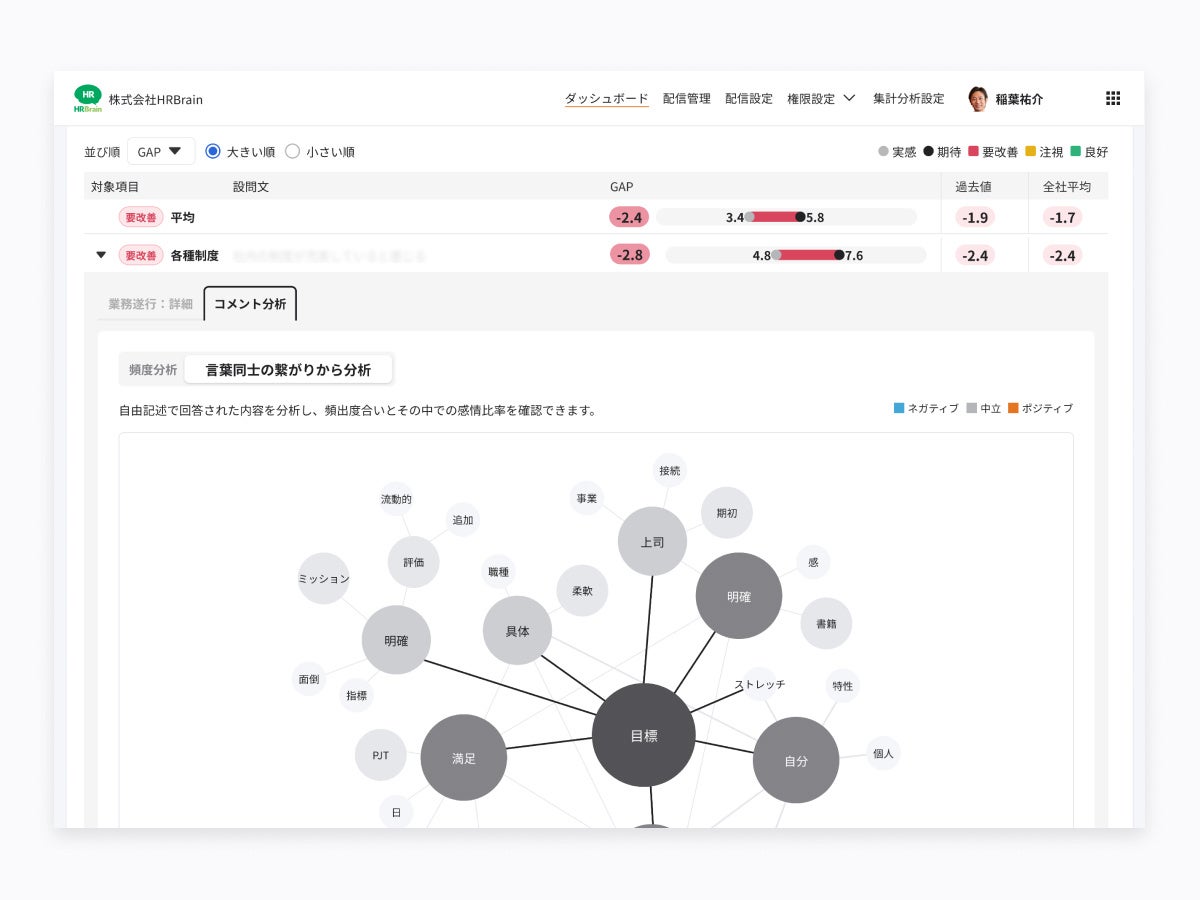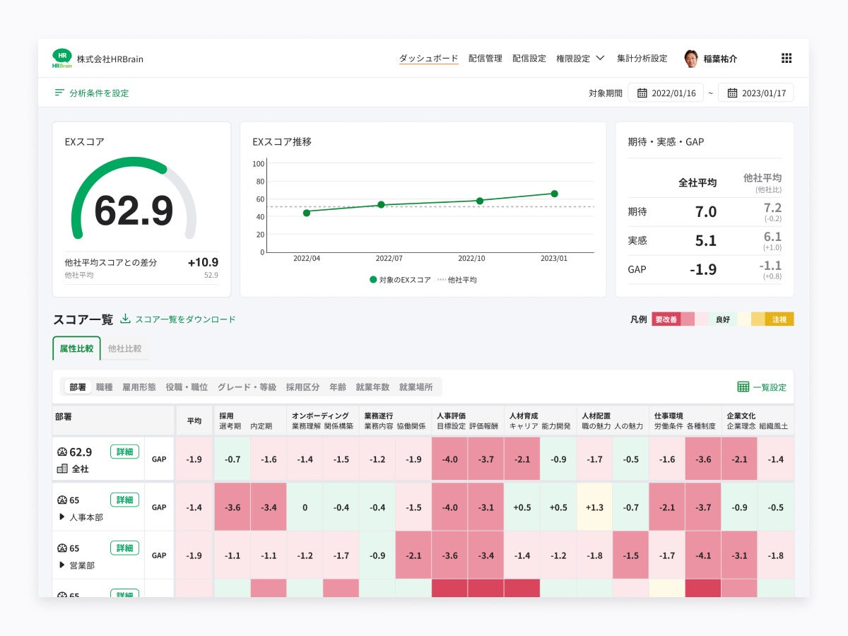 従業員の期待値と実感を同時に計測することで領域ごとのギャップを比較でき、組織課題に優先順位をつけることが可能です。部署や職種、役職、年齢などさまざまな分析軸を切り替えることもできるため、部署や属性固有の具体性の高い組織課題の特定も可能です。(特許出願済)