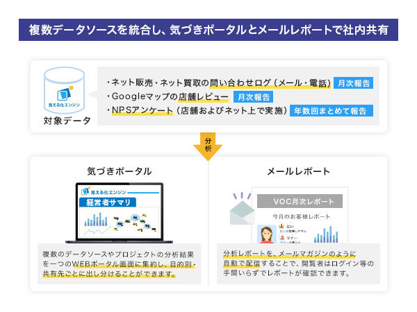 電話・メール等で寄せられる問い合わせログ、店舗レビュー、NPS®(※2)アンケートを中心に、あらゆる「お客様の声」を集約し、部門横断で扱うことで分析の質を向上し、メールレポートやWEBポータルで社内共有するほか、声をもとにした改善提案につなげています。