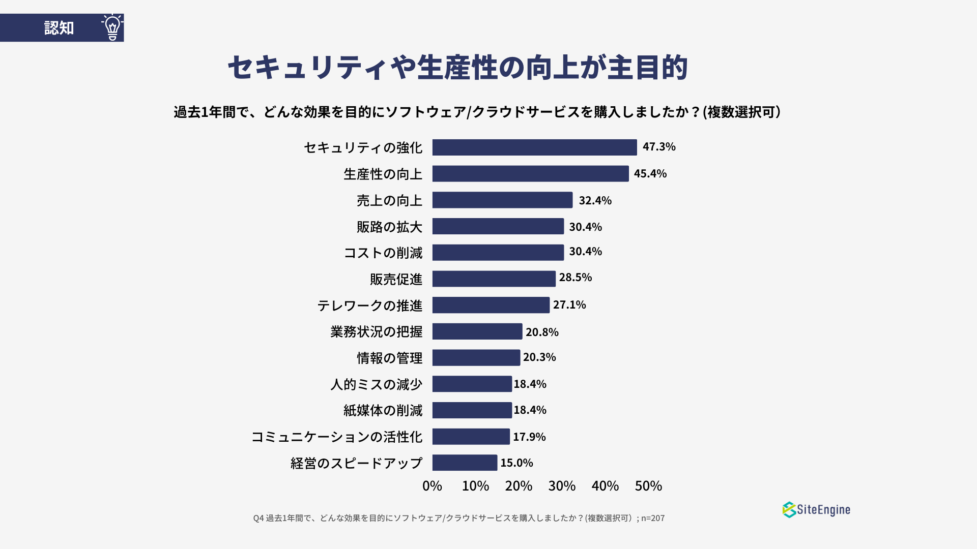 デジタルマーケティング支援のサービスを提供しているサイトエンジンでは、ソフトウェア/クラウドサービス事業をはじめとして、様々な事業のマーケティング支援をしています。今回、ソフトウェア/クラウドサービスの購入動向について情報収集することで購買傾向をつかみ、マーケティング施策の立案に活かすため、企業の購買担当者を対象としたアンケート調査を行いました。