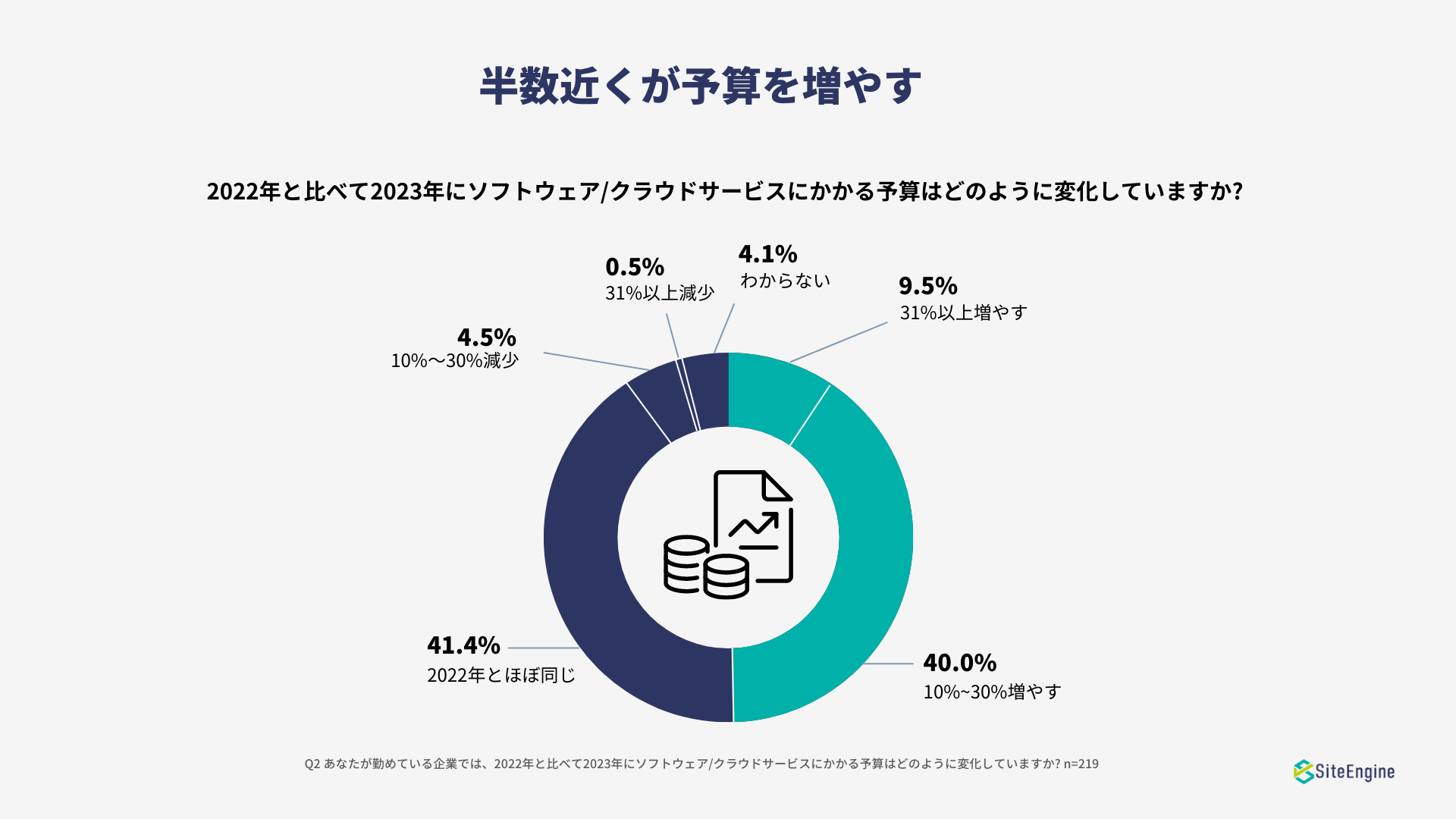 コンテンツマーケティング支援を行うサイトエンジン株式会社(本社:東京都世田谷区 代表取締役:毛塚智彦 以下、サイトエンジン)は、2023年2月27日~2023年2月28日に、企業の購買意思決定者219名を対象に、ソフトウェア/クラウドサービスの購入に関するアンケート調査を実施しました。