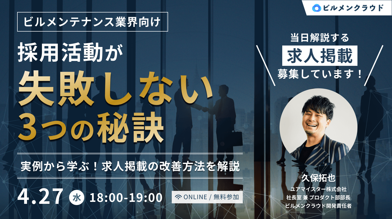 「ビルメンクラウド」は、従来はマンパワーで対応していた業務をシステムに置き換え、業務効率化や高収益化を実現することで、業界課題である”人手不足”の解消に貢献することを目的に開発しました。ビルメンテナンス企業にヒアリングを重ねる中で、”人手不足”の要因として、採用活動に課題を感じる声が多く挙がりました。そこで、4月27日(水)にビルメンテナンス業界向け新セミナー『採用活動が失敗しない3つの秘訣 ~実例から学ぶ!求人掲載の改善方法を解説~』を開催します。