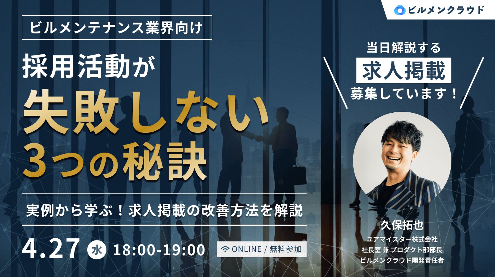 ビルメンクラウド、新セミナー『採用活動が失敗しない3つの秘訣 ~実例から学ぶ!求人掲載の改善方法を解説~』を4月27日開催