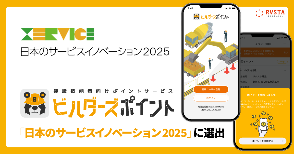 株式会社リバスタ(本社:東京都江東区、代表取締役:高橋巧、以下 当社)が提供する建設技能者向けポイントサービス「ビルダーズポイント」が、公益財団法人日本生産性本部 サービス産業生産性協議会が選定・公表する「日本のサービスイノベーション2025」に選出されました。「ビルダーズポイント」は、元請会社が建設技能者(以下 技能者)へ直接働きかけることを可能にしたソリューションであり、建設現場の活性化と業界全体の魅力向上に寄与する点が高く評価されました。