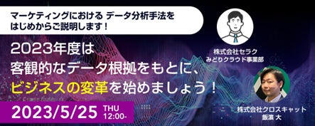 株式会社クロスキャットは、データ分析領域に強みを持つ株式会社セラクと協力し、5月25日(木)12時より、マーケティングや商品企画のご担当者などを対象に共同Webセミナー「2023年度は客観的なデータ根拠をもとに、ビジネスの変革を始めましょう!」を開催いたします。