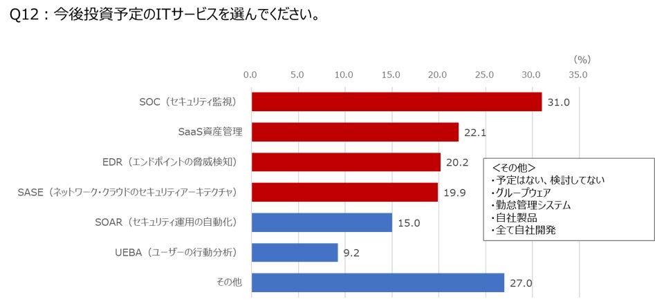 今後利用したいITサービスとしては、 SOC(セキュリティ監視)、EDR(エンドポイントの脅威検知)、SASE(ネットワーク・クラウドのセキュリティアーキテクチャ)が上位となった。(グラフ4)