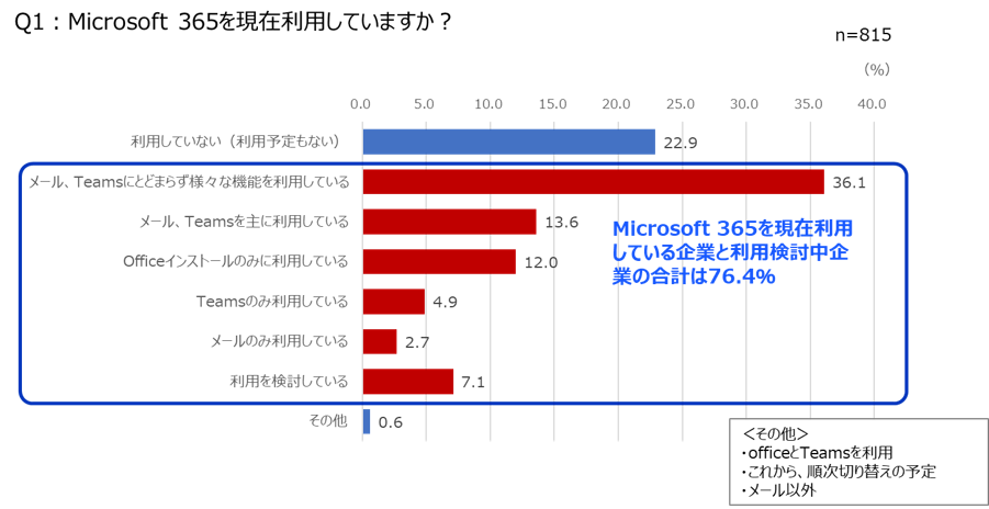 (1)76.4%の企業がMicrosoft 365を利用または利用を検討中だが、デバイス管理機能やSharePointの利用は半数以下で、さらなる利活用が課題