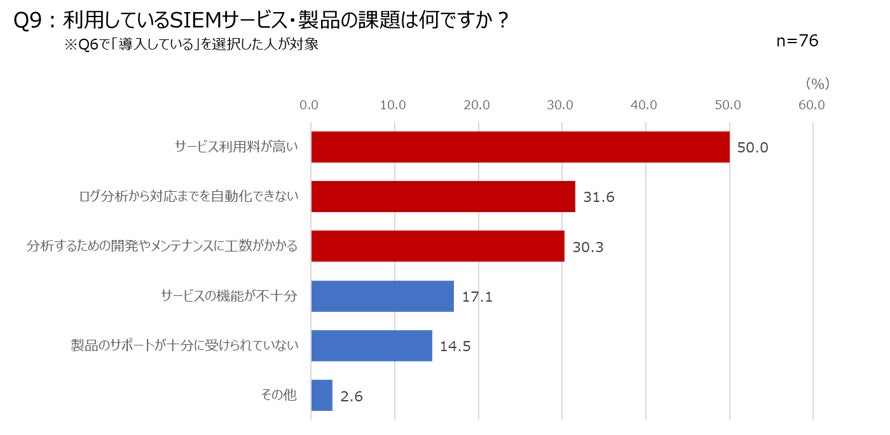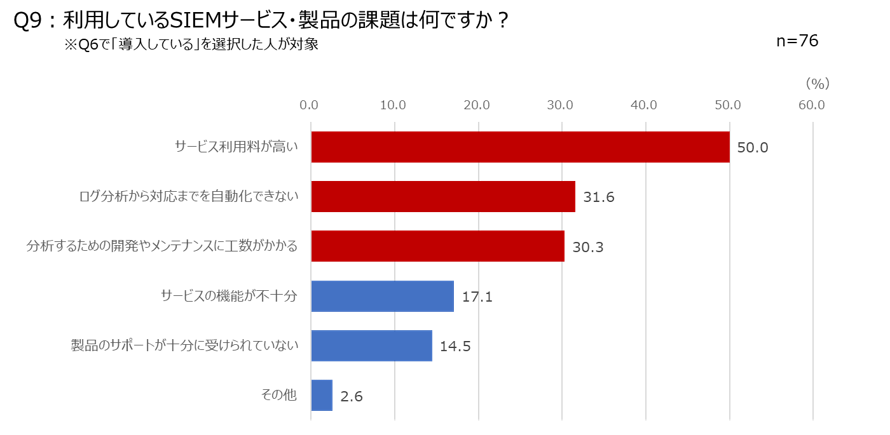 (3)SIEMサービス・製品を導入済み企業のうち50%が価格に不満を持っており、次いで工数がかかること、業務の自動化ができないことと続く